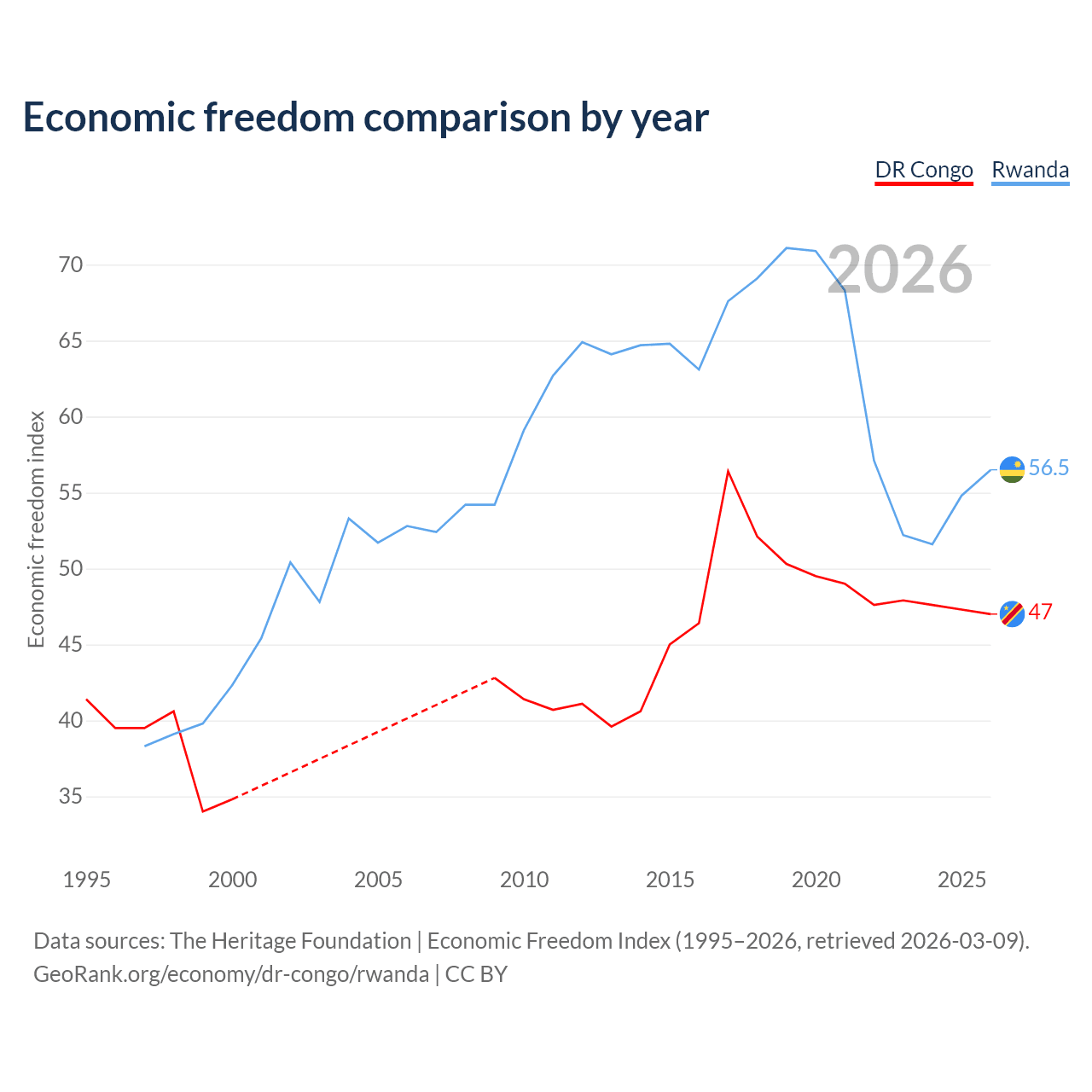 The Economic Freedom Index for the DR Congo is 47, ranking 176/197, compared to 56.5 for Rwanda, ranking 121/197. The chart above displays a comparison of annual changes in economic freedom indexes.