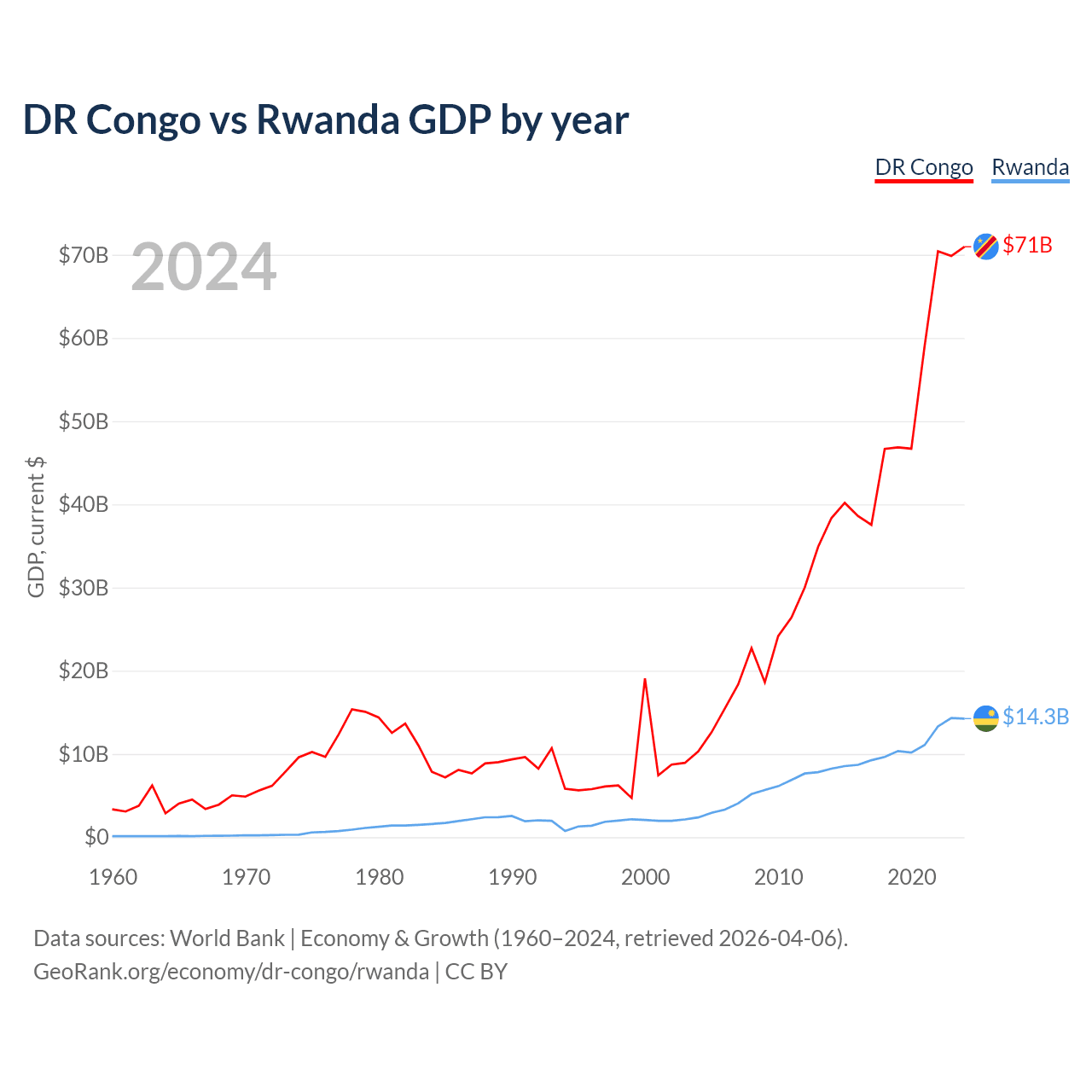 The DR Congo has a GDP of $71B compared to $14.3B for Rwanda, ranking 87/197 and 144/197 by economy size, respectively.