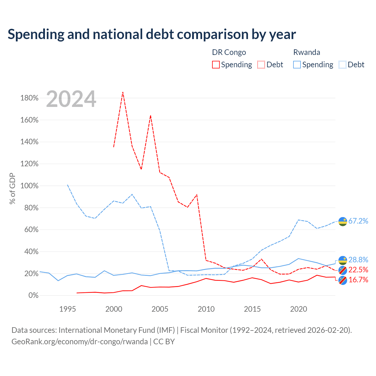 The DR Congo has $16B in government debt (22.5% of GDP), compared to $9.58B (67.2% of GDP) in Rwanda.