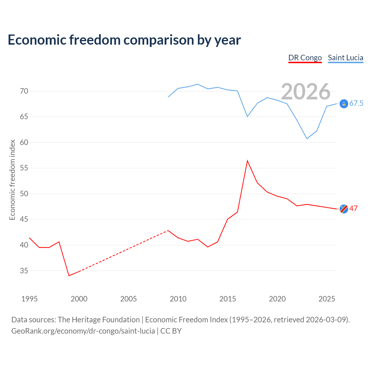 The Economic Freedom Index for the DR Congo is 47, ranking 176/197, compared to 67.5 for Saint Lucia, ranking 57/197. The chart above displays a comparison of annual changes in economic freedom indexes.