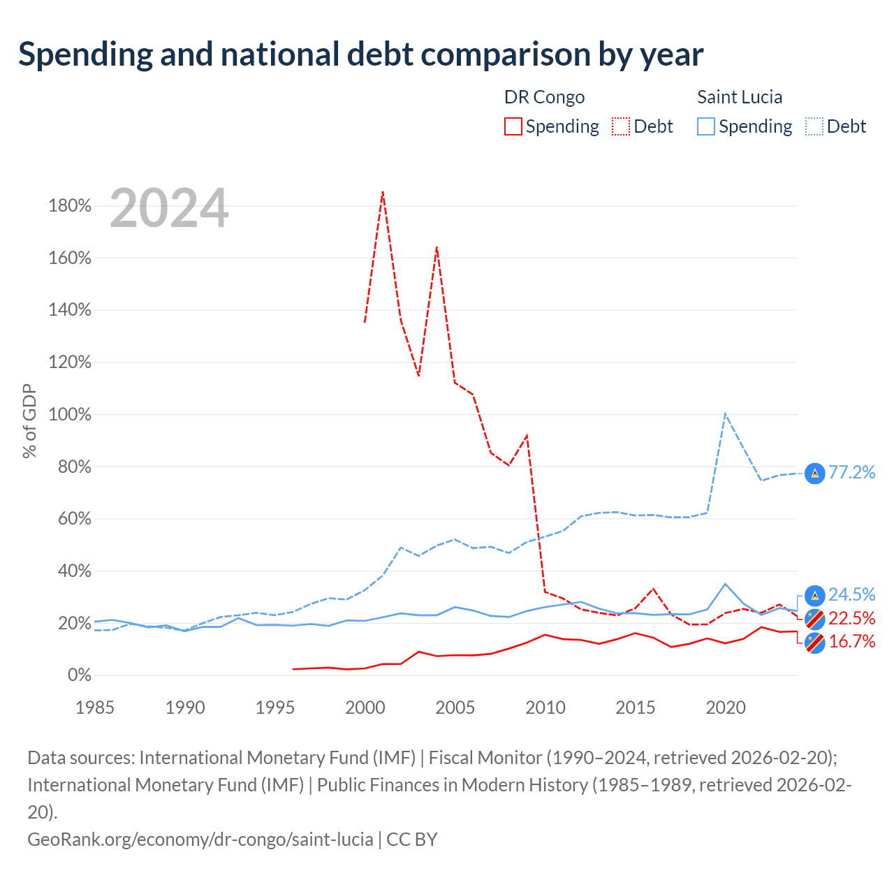 The DR Congo has $16B in government debt (22.5% of GDP), compared to $1.97B (77.2% of GDP) in Saint Lucia.