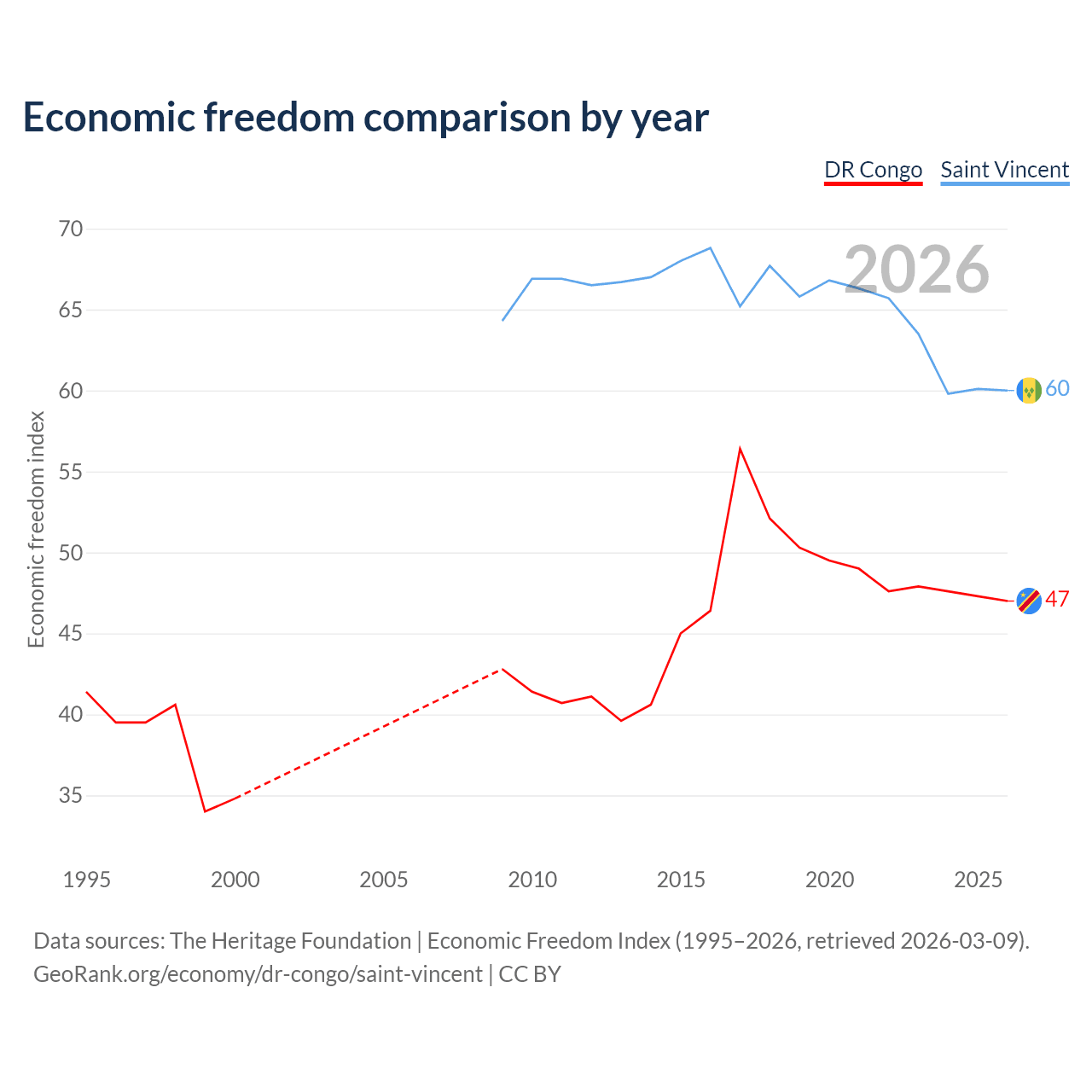The Economic Freedom Index for the DR Congo is 47, ranking 176/197, compared to 60 for Saint Vincent, ranking 98/197. The chart above displays a comparison of annual changes in economic freedom indexes.