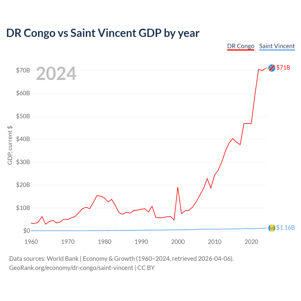 The DR Congo has a GDP of $71B compared to $1.16B for Saint Vincent, ranking 87/197 and 186/197 by economy size, respectively.