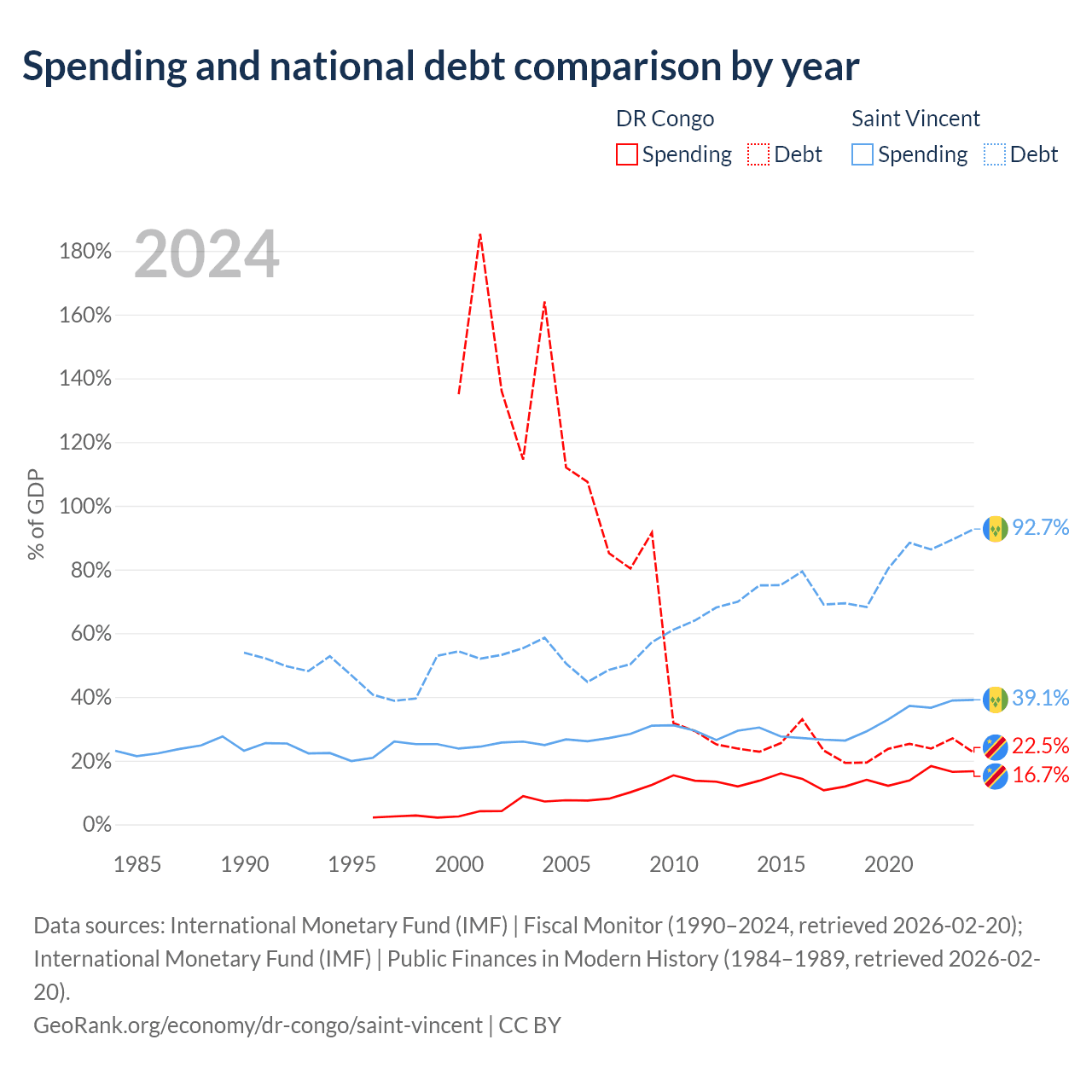 The DR Congo has $16B in government debt (22.5% of GDP), compared to $1.07B (92.7% of GDP) in Saint Vincent.
