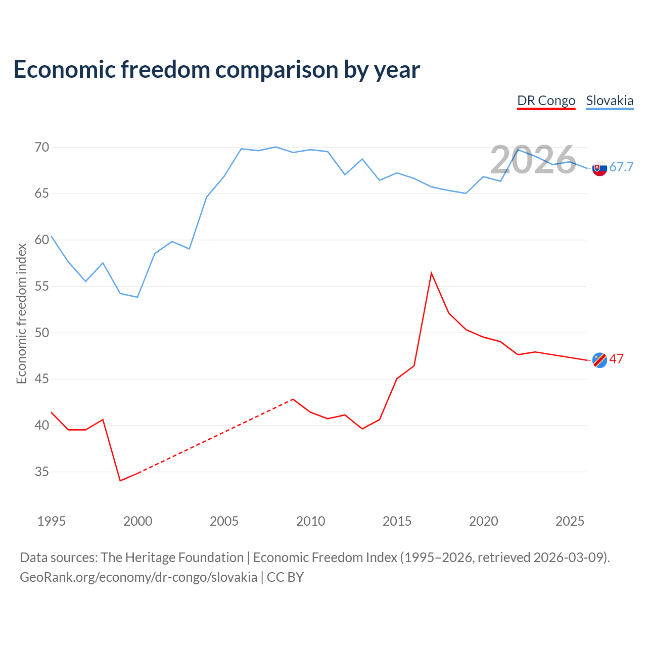 The Economic Freedom Index for the DR Congo is 47, ranking 176/197, compared to 67.7 for Slovakia, ranking 54/197. The chart above displays a comparison of annual changes in economic freedom indexes.