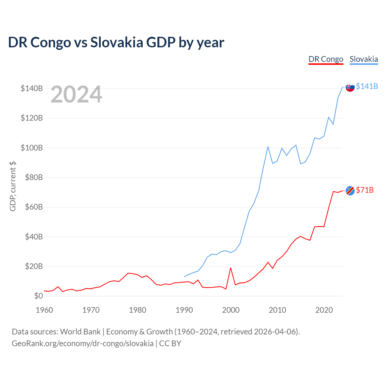 The DR Congo has a GDP of $71B compared to $141B for Slovakia, ranking 87/197 and 61/197 by economy size, respectively.