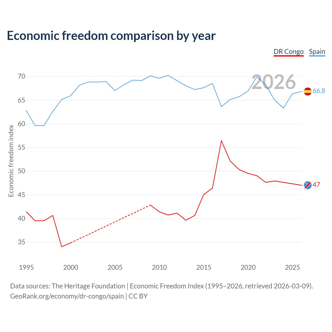The Economic Freedom Index for the DR Congo is 47, ranking 176/197, compared to 66.8 for Spain, ranking 59/197. The chart above displays a comparison of annual changes in economic freedom indexes.