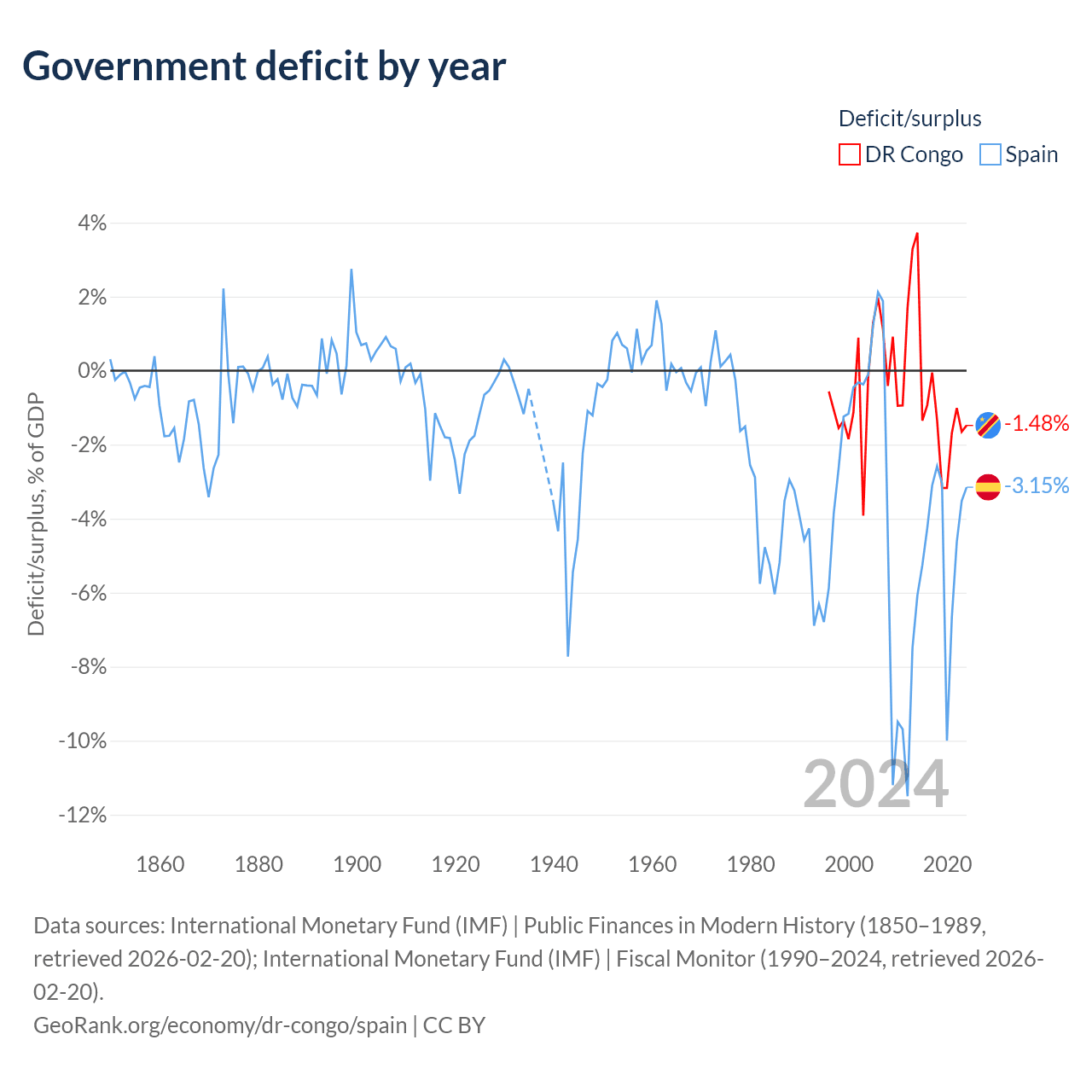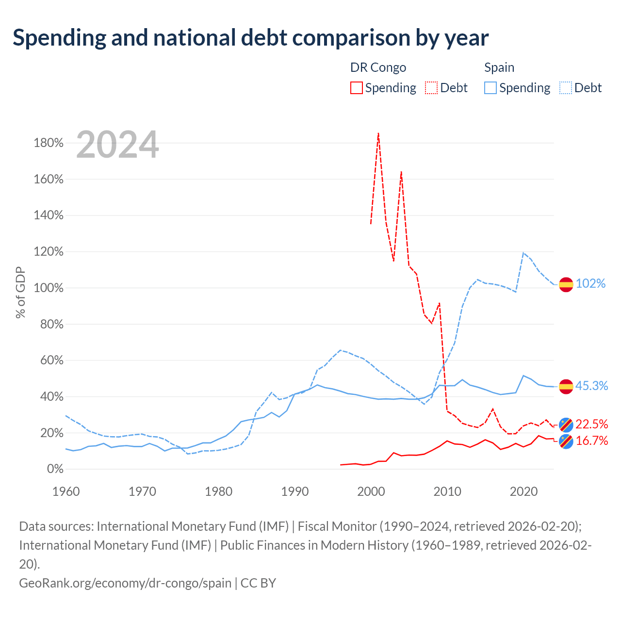 The DR Congo has $16B in government debt (22.5% of GDP), compared to $1.75T (101.6% of GDP) in Spain.