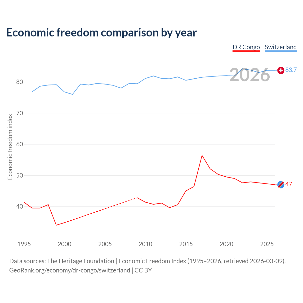 The Economic Freedom Index for the DR Congo is 47, ranking 176/197, compared to 83.7 for Switzerland, ranking 2/197. The chart above displays a comparison of annual changes in economic freedom indexes.