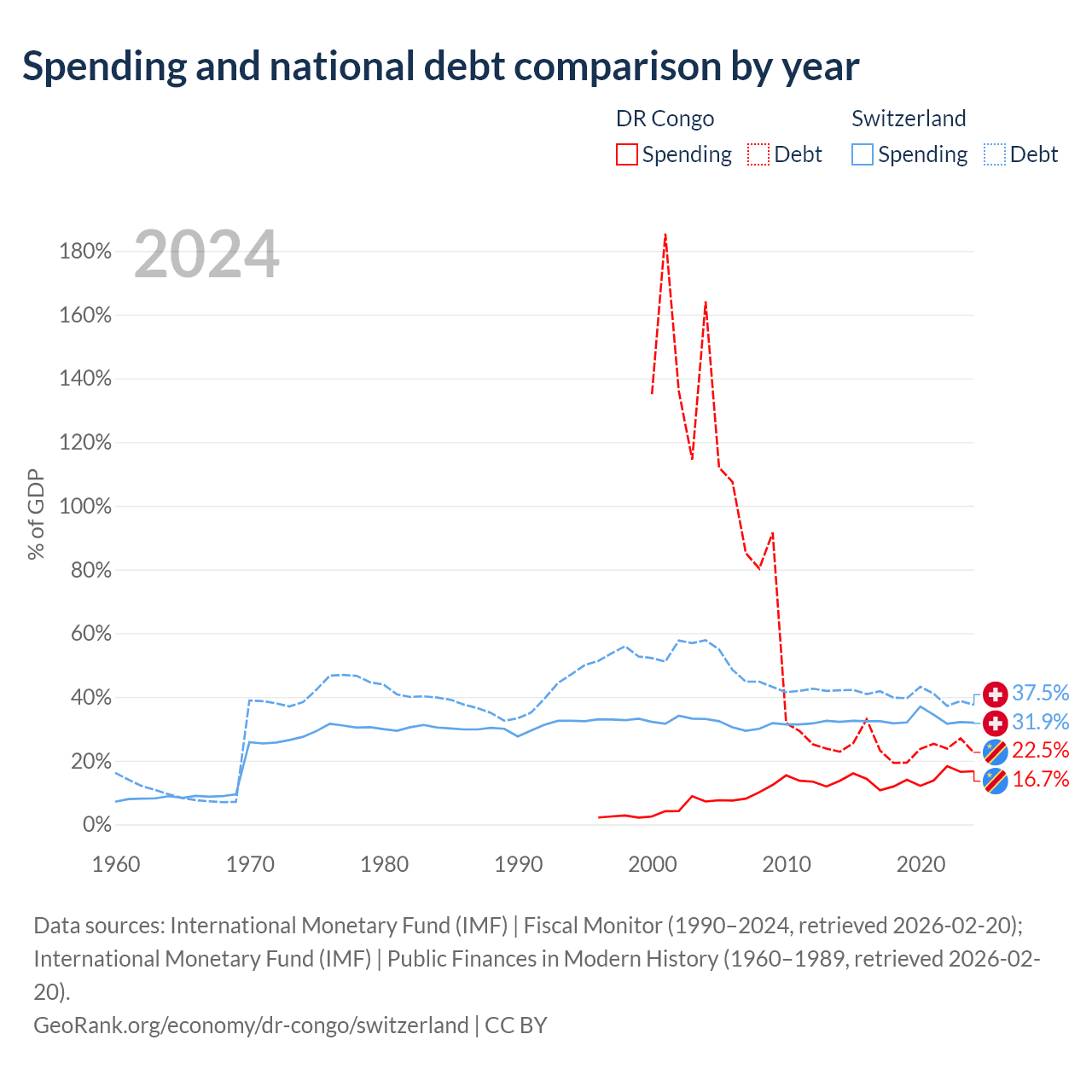 The DR Congo has $16B in government debt (22.5% of GDP), compared to $351B (37.5% of GDP) in Switzerland.
