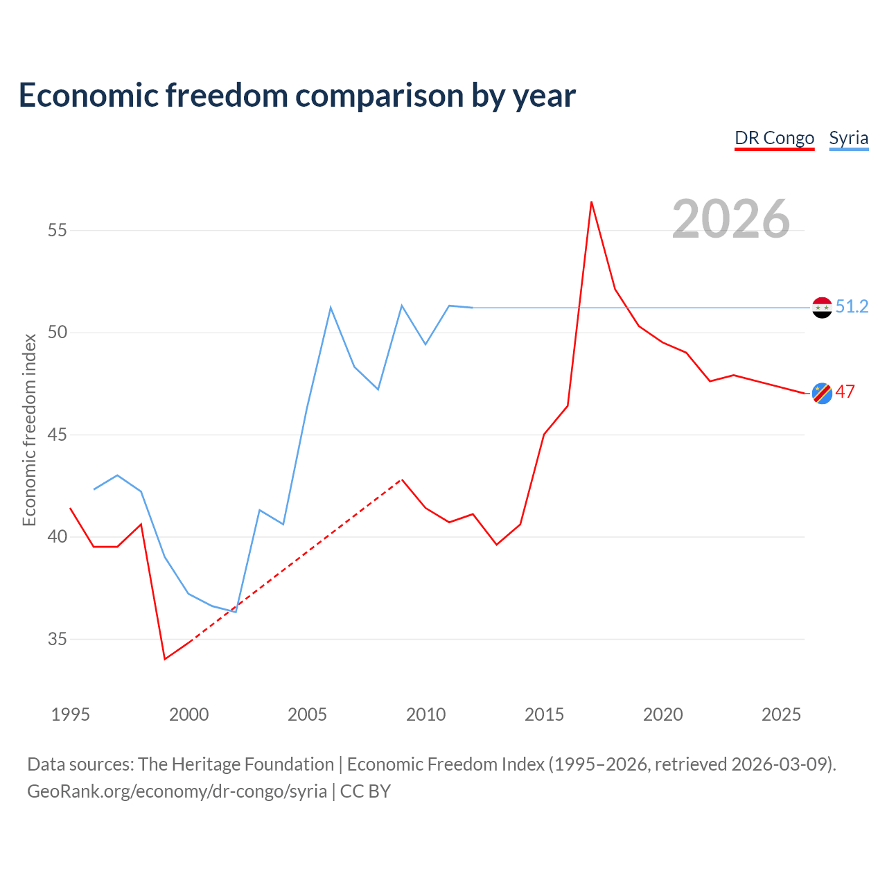 The Economic Freedom Index for the DR Congo is 47, ranking 176/197, compared to 51.2 for Syria, ranking 155/197. The chart above displays a comparison of annual changes in economic freedom indexes.