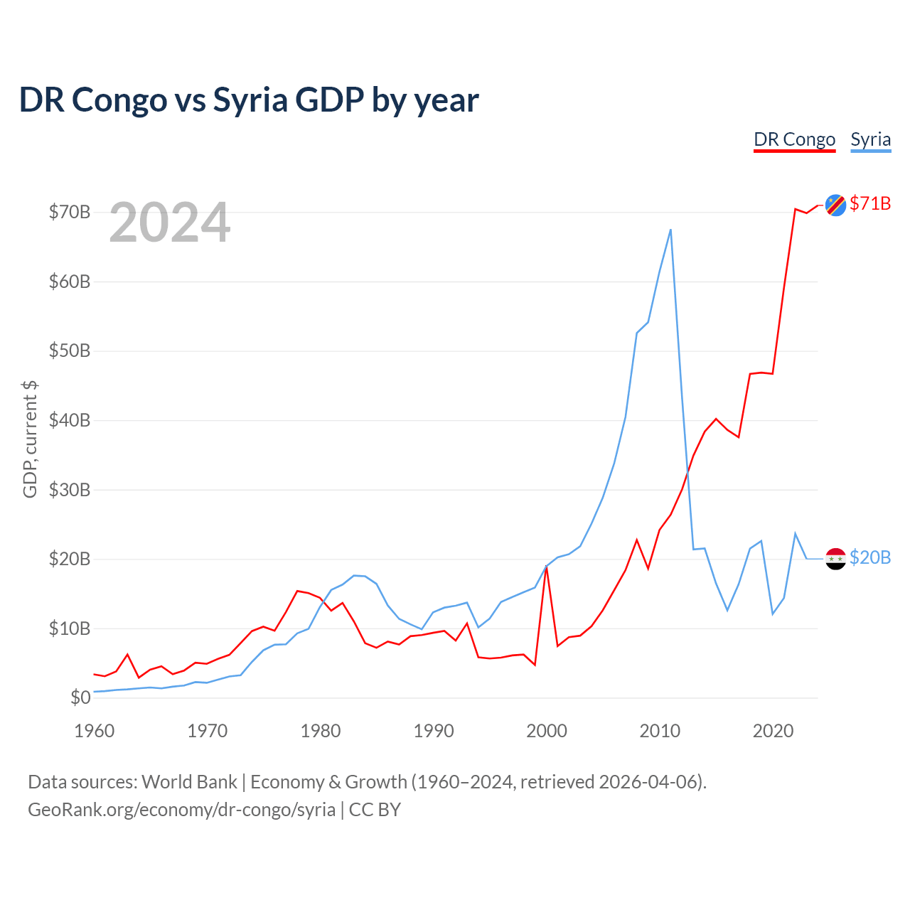 The DR Congo has a GDP of $71B compared to $20B for Syria, ranking 87/197 and 129/197 by economy size, respectively.
