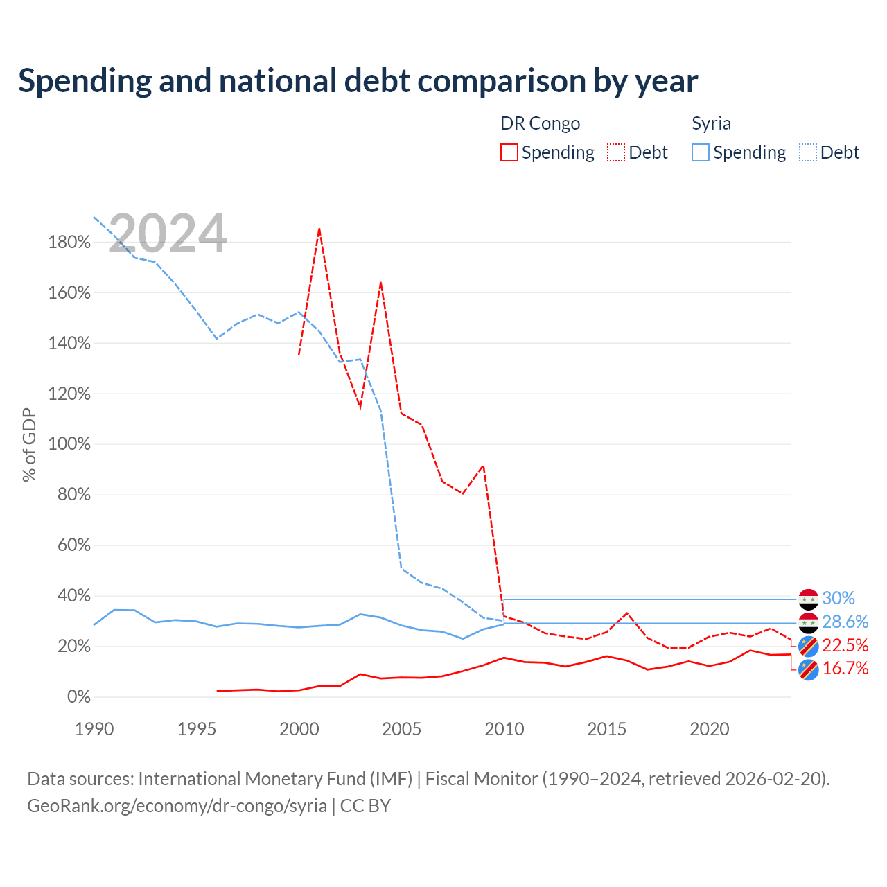 The DR Congo has $16B in government debt (22.5% of GDP), compared to $18.4B (30% of GDP) in Syria.