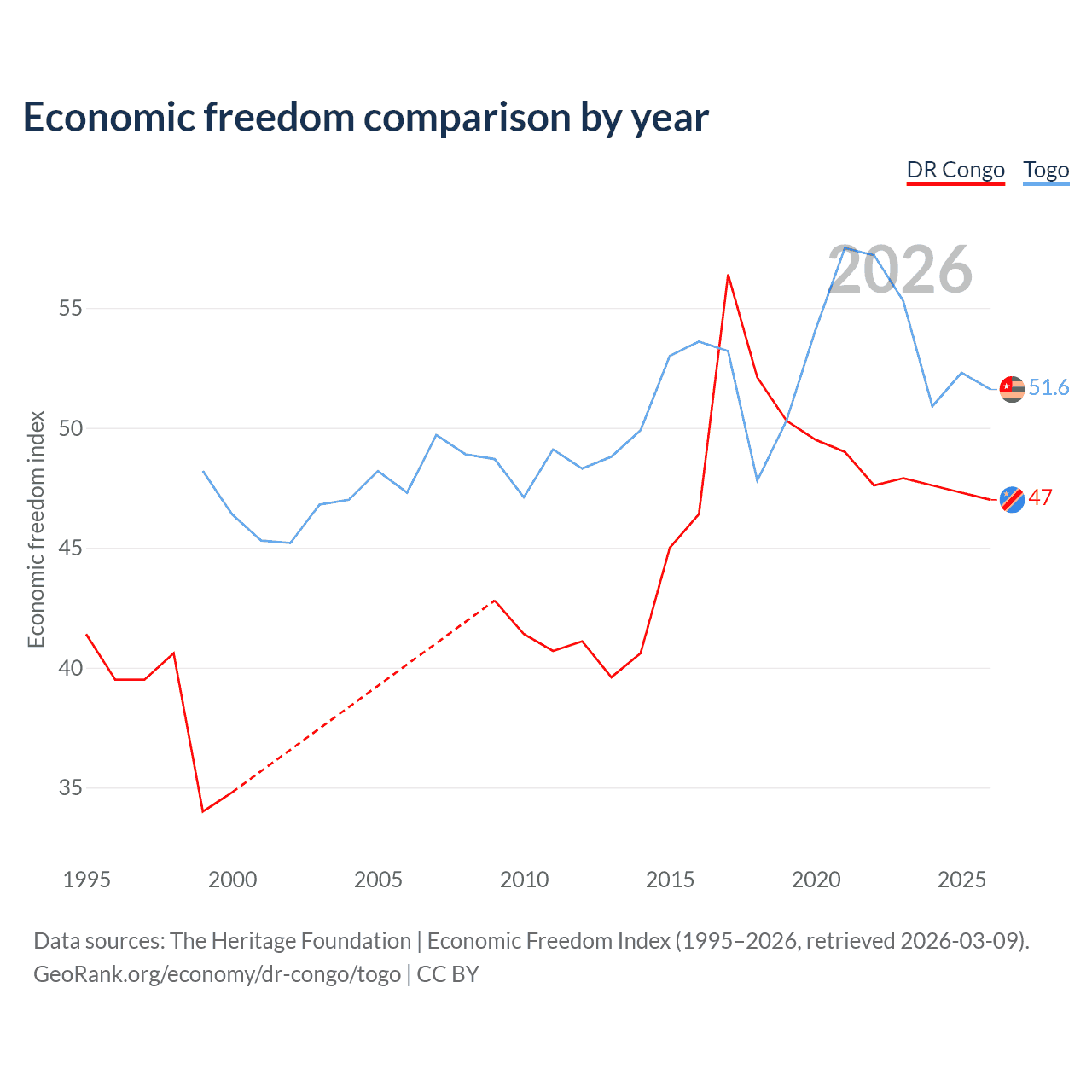 The Economic Freedom Index for the DR Congo is 47, ranking 176/197, compared to 51.6 for Togo, ranking 153/197. The chart above displays a comparison of annual changes in economic freedom indexes.