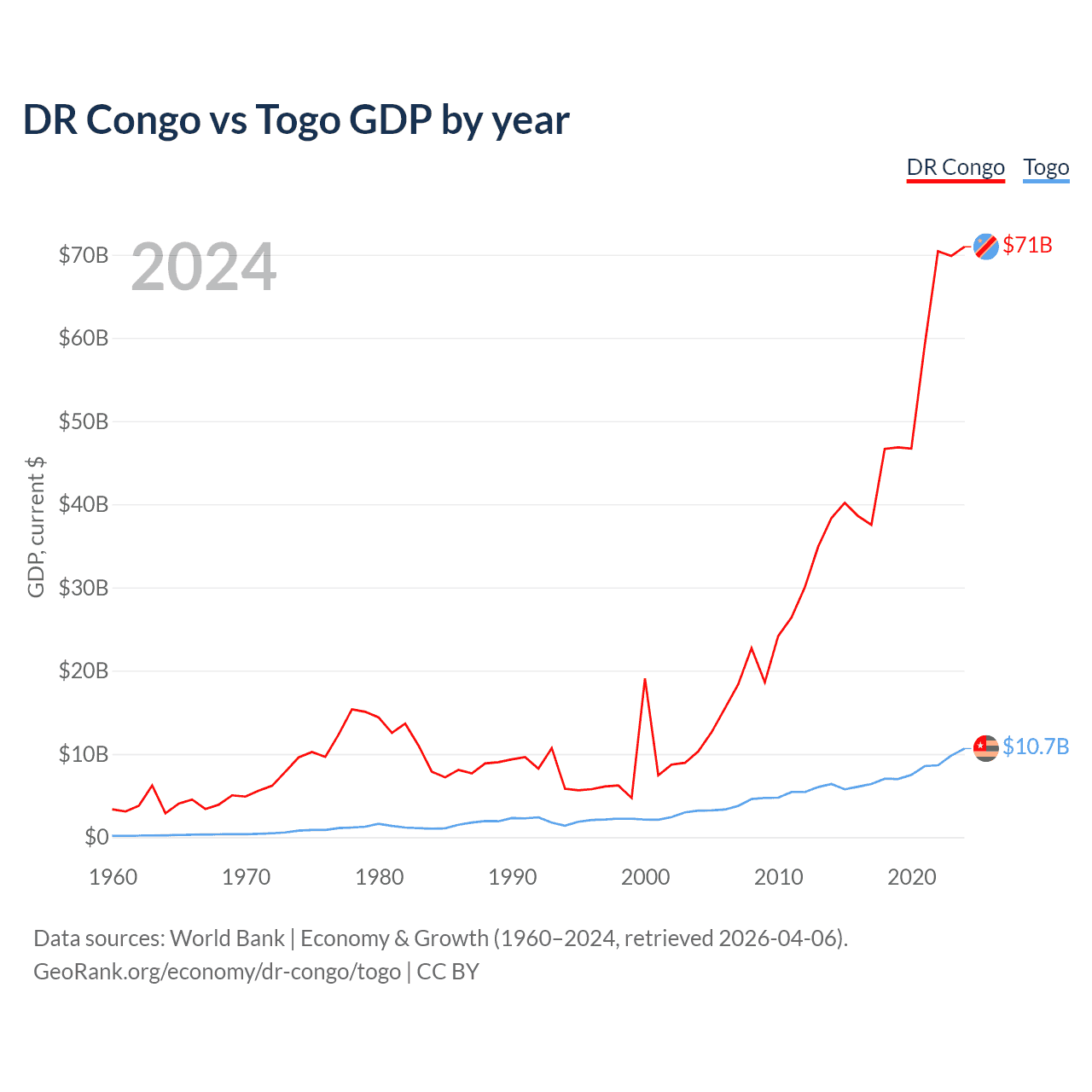 The DR Congo has a GDP of $71B compared to $10.7B for Togo, ranking 87/197 and 154/197 by economy size, respectively.