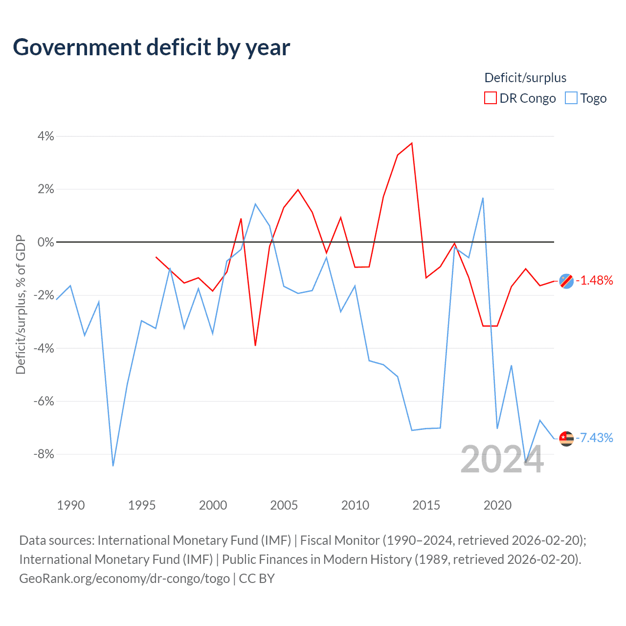The DR Congo has $16B in government debt (22.5% of GDP), compared to $7.68B (72.1% of GDP) in Togo.