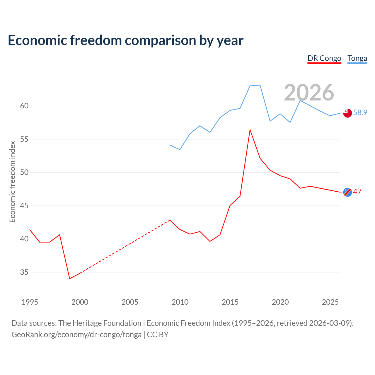 The Economic Freedom Index for the DR Congo is 47, ranking 176/197, compared to 58.9 for Tonga, ranking 107/197. The chart above displays a comparison of annual changes in economic freedom indexes.