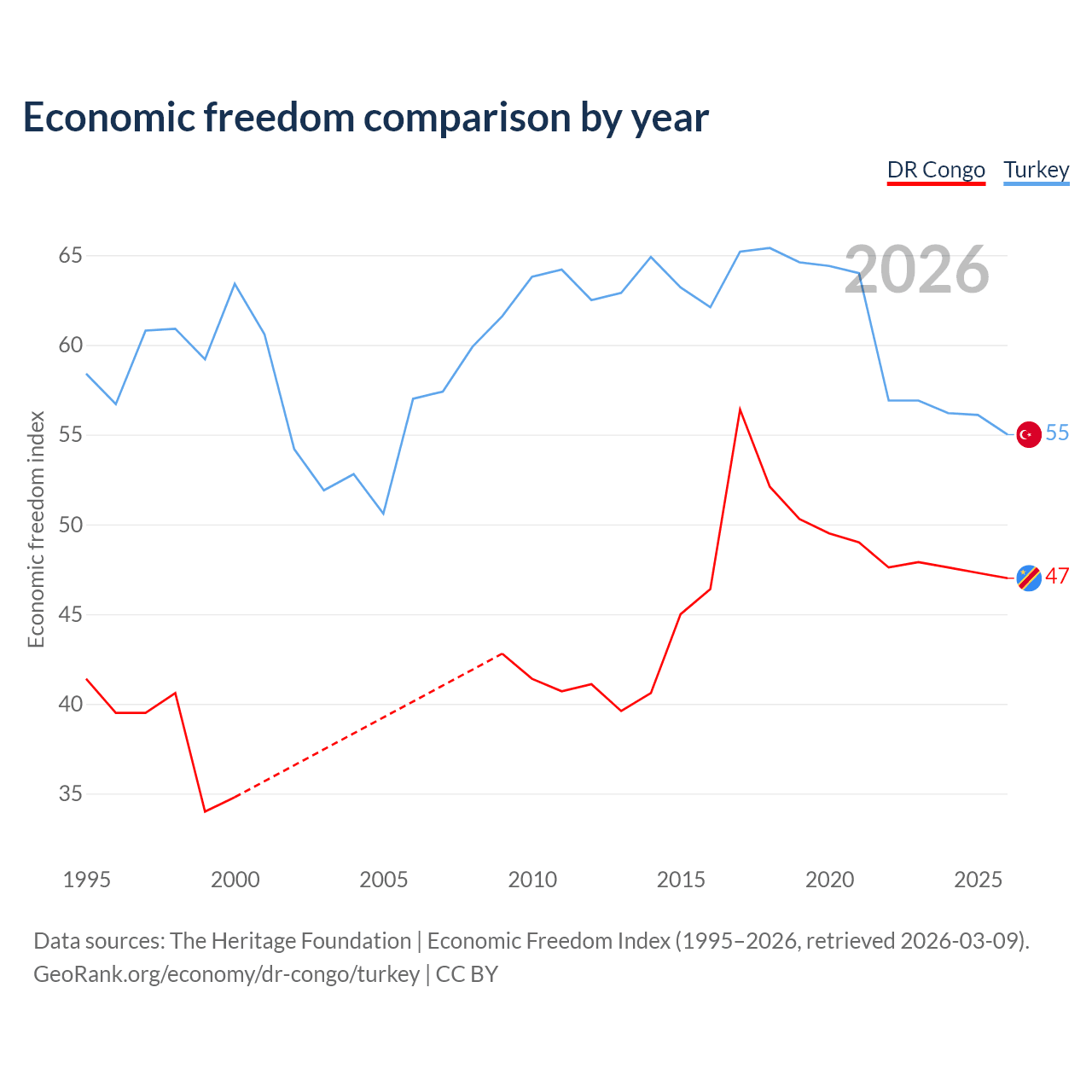 The Economic Freedom Index for the DR Congo is 47, ranking 176/197, compared to 55 for Turkey, ranking 129/197. The chart above displays a comparison of annual changes in economic freedom indexes.