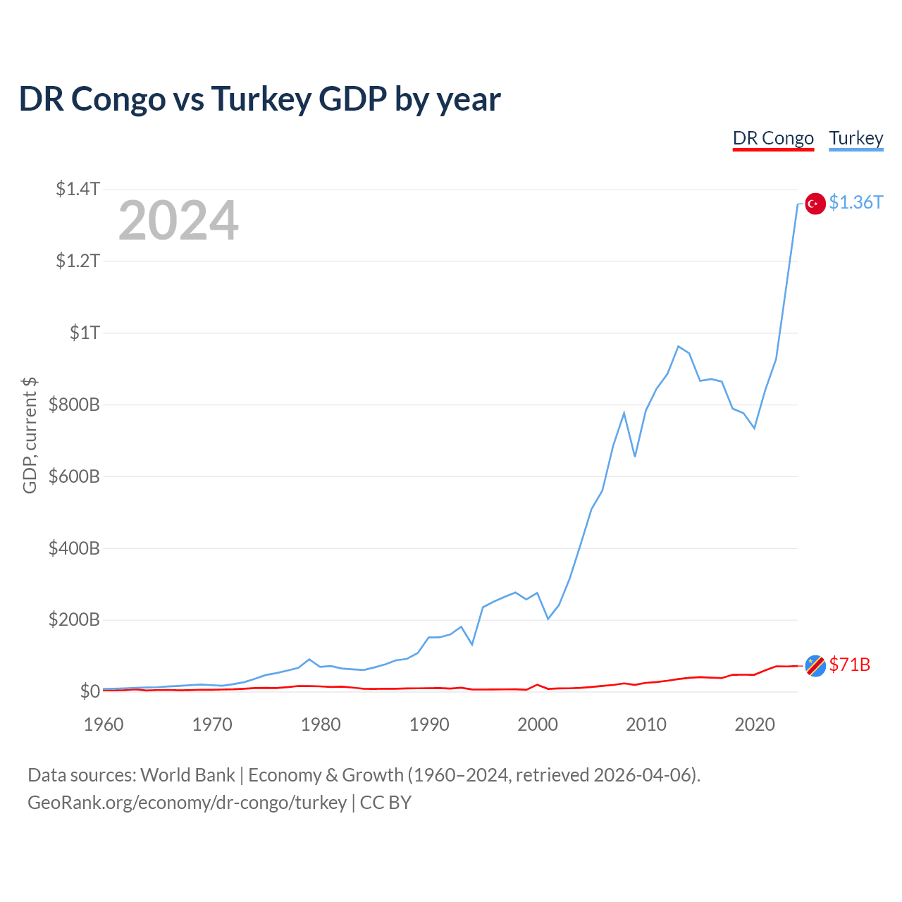 The DR Congo has a GDP of $71B compared to $1.36T for Turkey, ranking 87/197 and 17/197 by economy size, respectively.