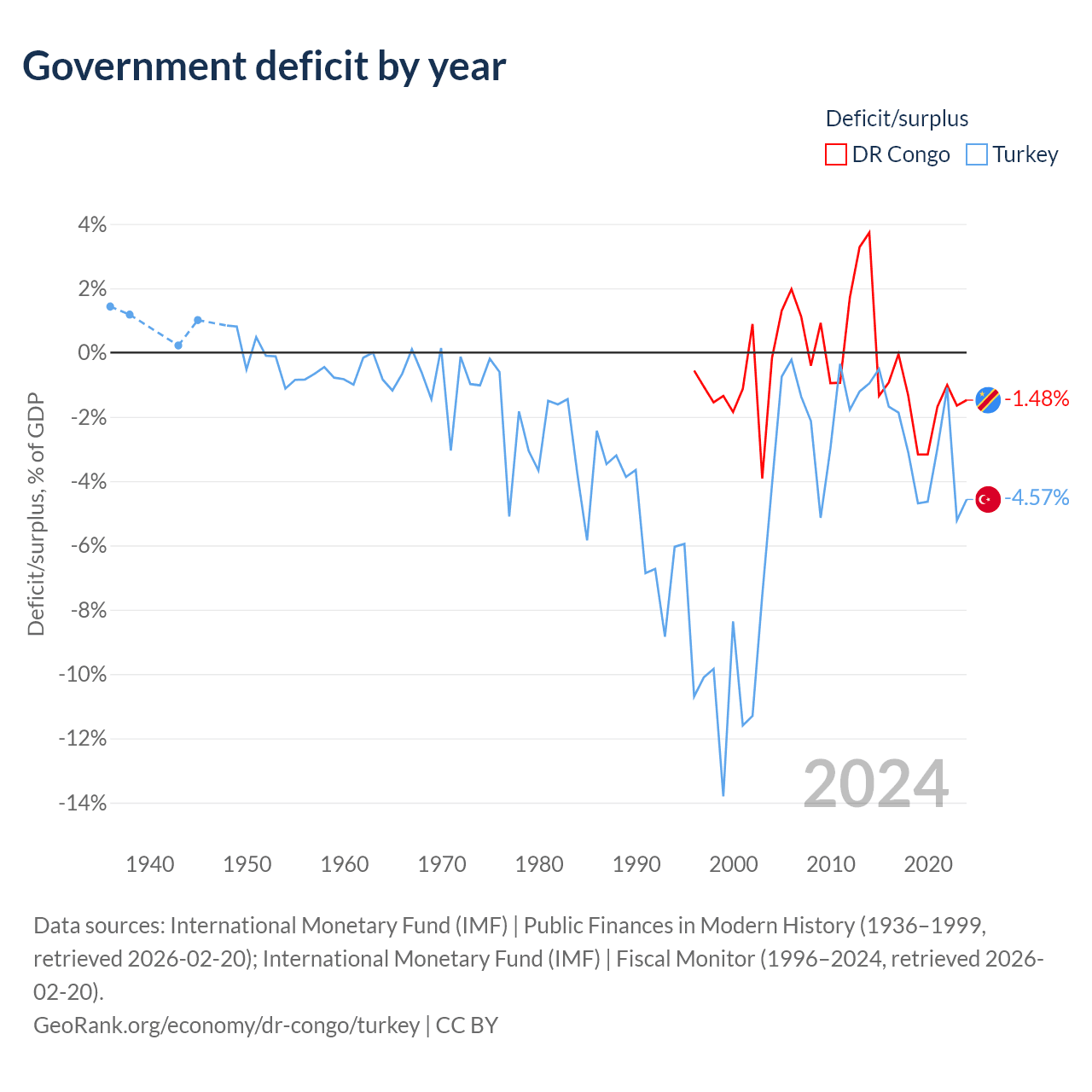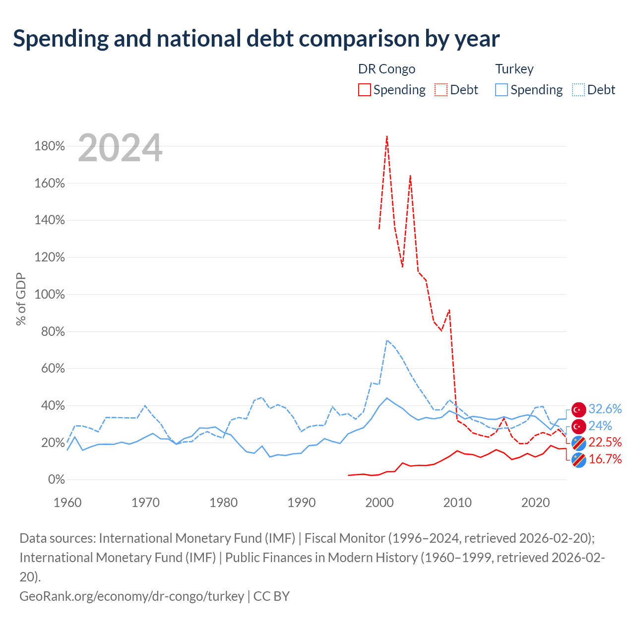 The DR Congo has $16B in government debt (22.5% of GDP), compared to $327B (24% of GDP) in Turkey.