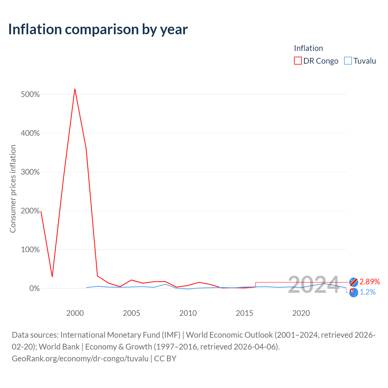 Over the past 16 years, the DR Congo has recorded an average annual inflation rate of 32.3%, compared with 2.59% in Tuvalu. In 2016, inflation was 2.89% in the DR Congo and 1.2% in Tuvalu.