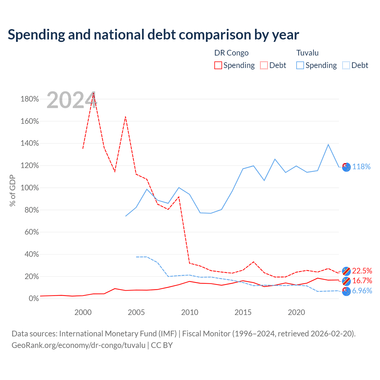 The DR Congo has $16B in government debt (22.5% of GDP), compared to $4.15M (6.96% of GDP) in Tuvalu.