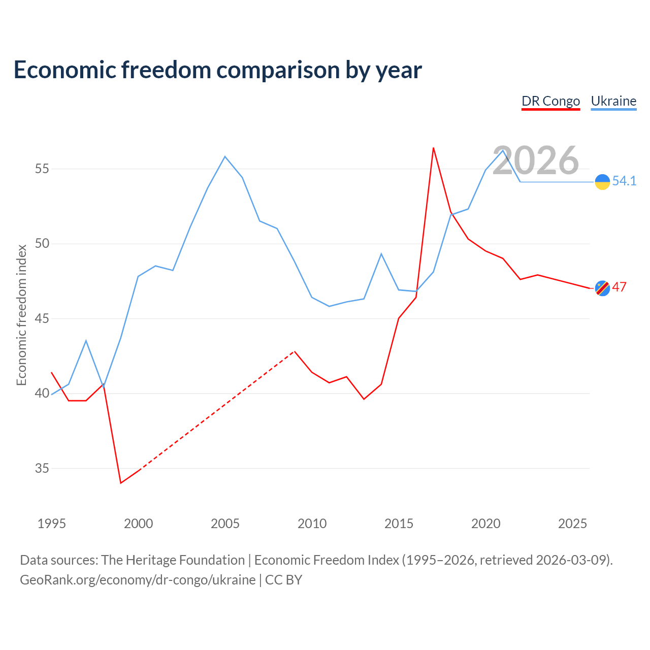 The Economic Freedom Index for the DR Congo is 47, ranking 176/197, compared to 54.1 for Ukraine, ranking 135/197. The chart above displays a comparison of annual changes in economic freedom indexes.