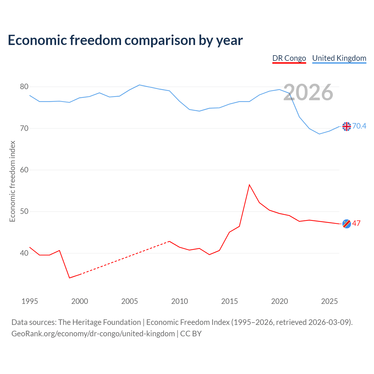 The Economic Freedom Index for the DR Congo is 47, ranking 176/197, compared to 70.4 for the United Kingdom, ranking 35/197. The chart above displays a comparison of annual changes in economic freedom indexes.