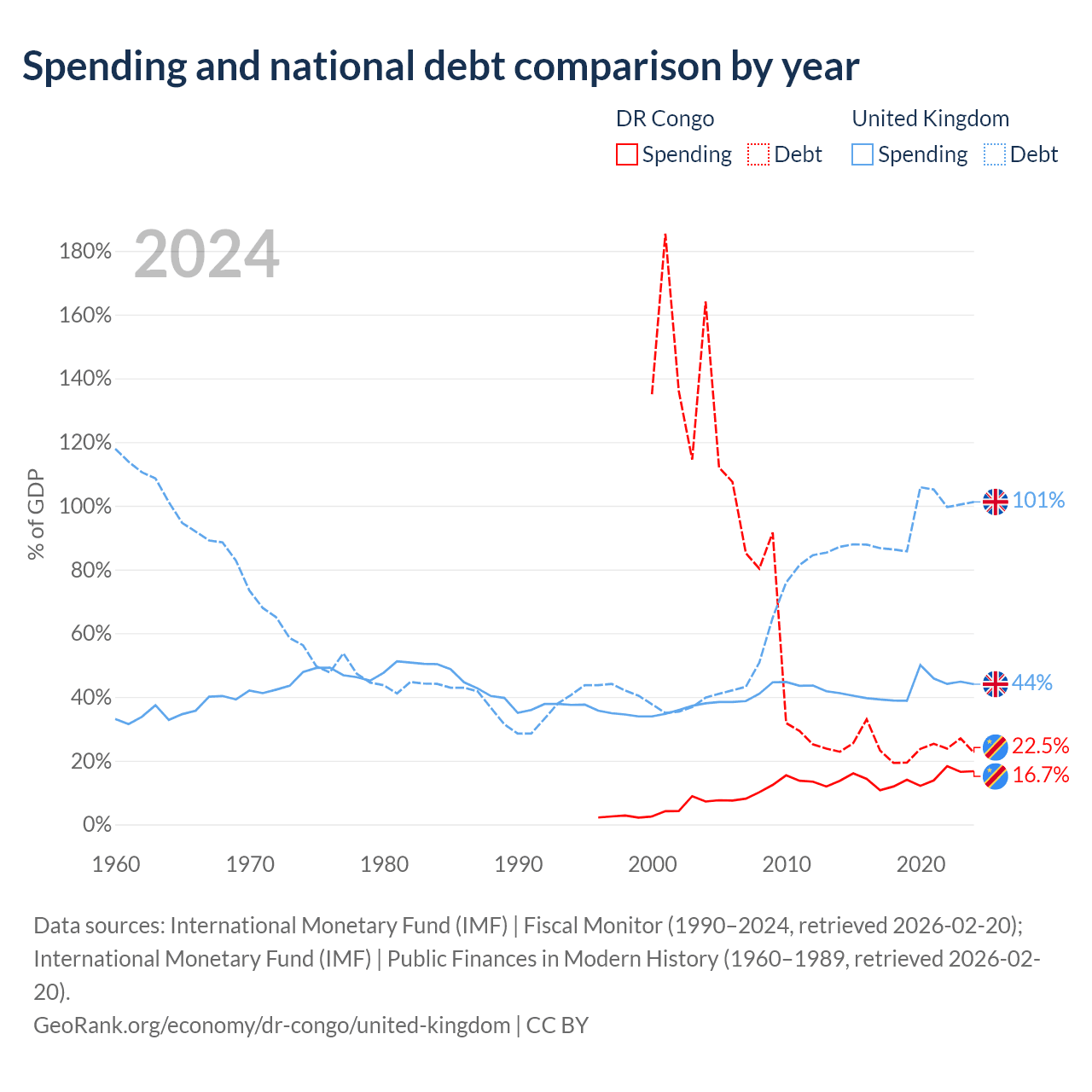 The DR Congo has $16B in government debt (22.5% of GDP), compared to $3.73T (101.2% of GDP) in the United Kingdom.