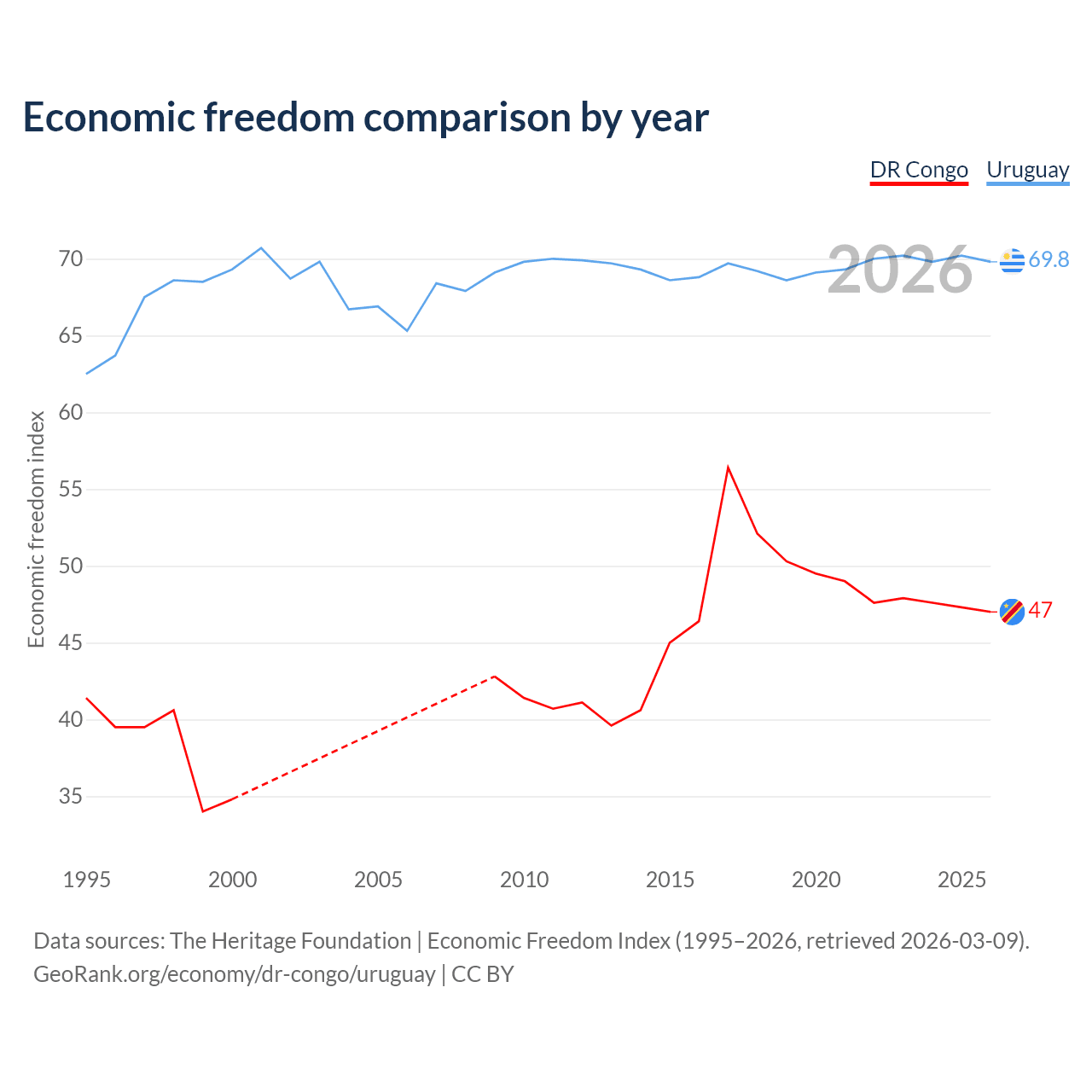 The Economic Freedom Index for the DR Congo is 47, ranking 176/197, compared to 69.8 for Uruguay, ranking 39/197. The chart above displays a comparison of annual changes in economic freedom indexes.