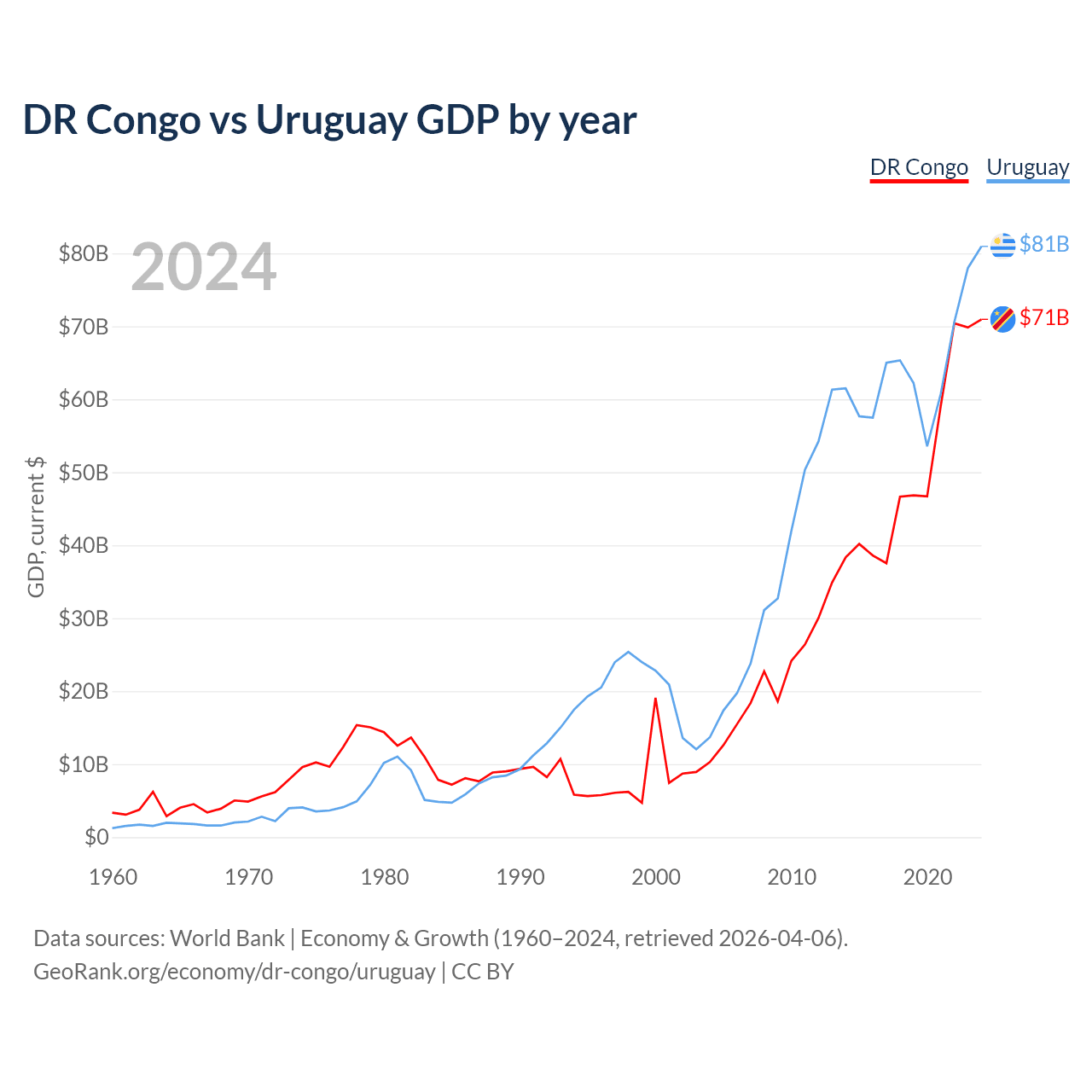 DR Congo vs Uruguay GDP by year