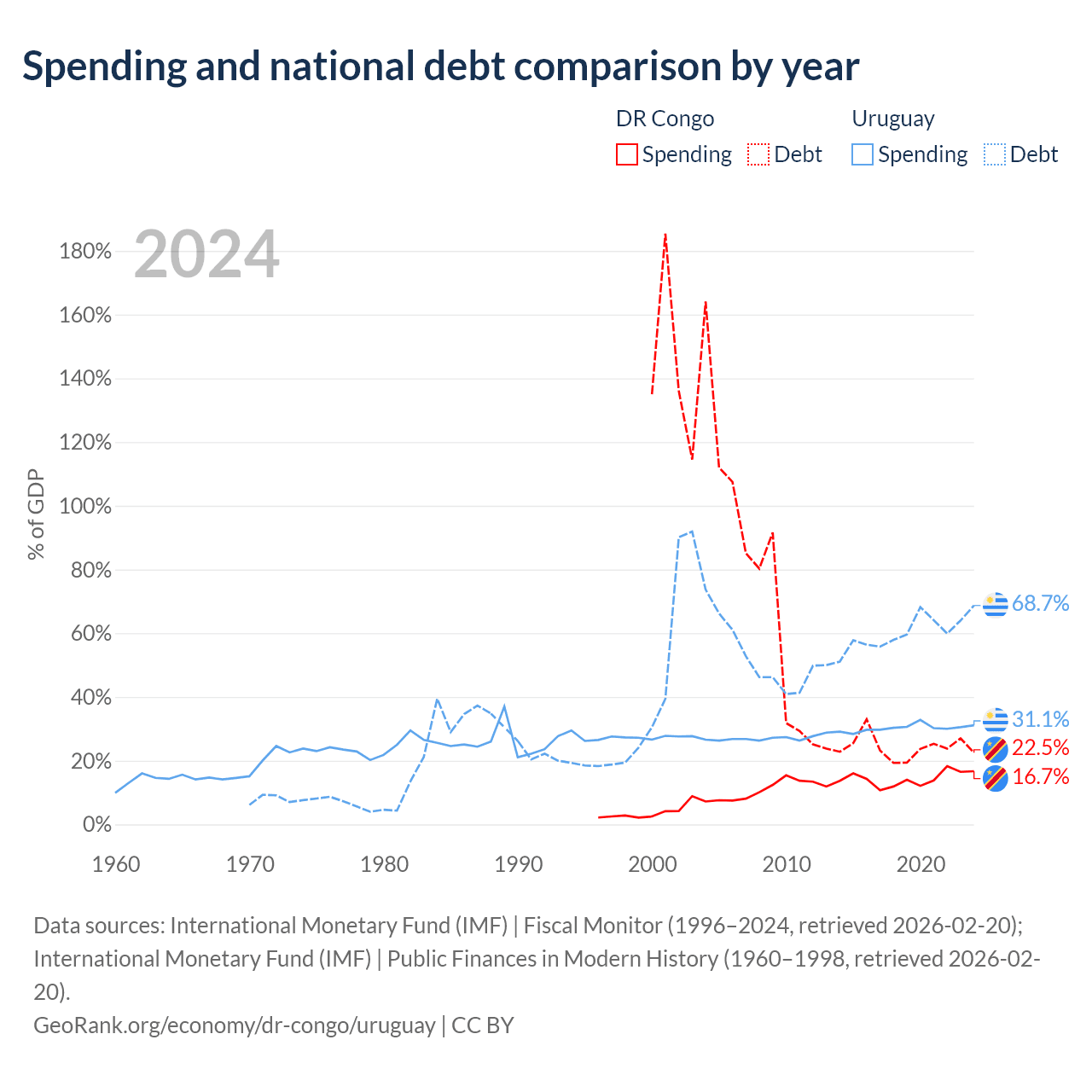 The DR Congo has $16B in government debt (22.5% of GDP), compared to $55.6B (68.7% of GDP) in Uruguay.