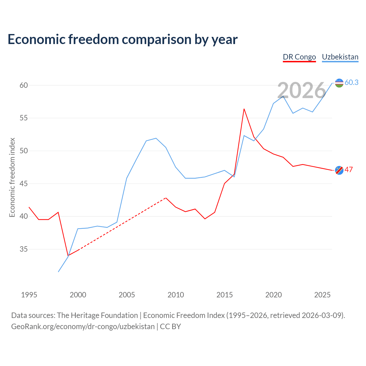 The Economic Freedom Index for the DR Congo is 47, ranking 176/197, compared to 60.3 for Uzbekistan, ranking 94/197. The chart above displays a comparison of annual changes in economic freedom indexes.