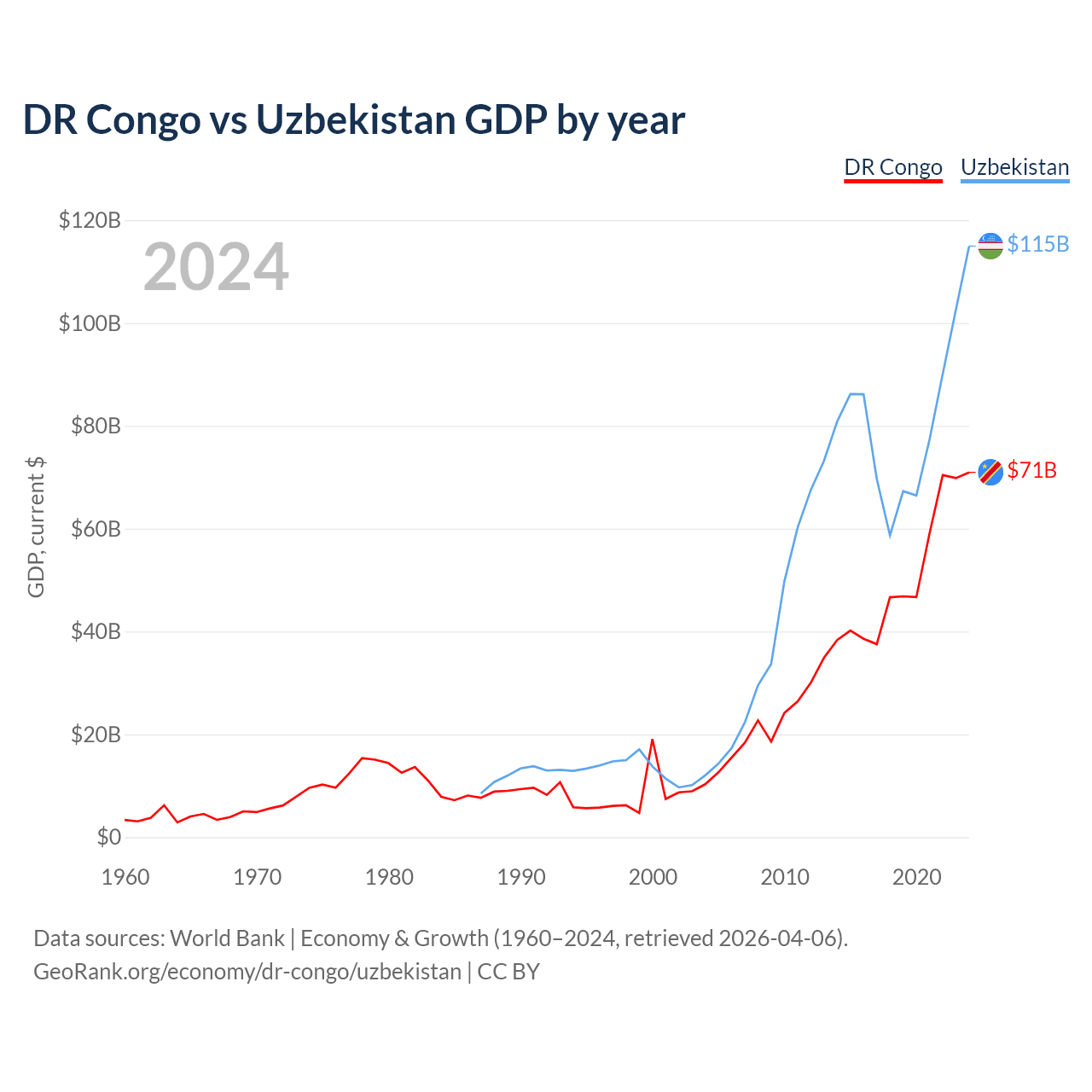 The DR Congo has a GDP of $71B compared to $115B for Uzbekistan, ranking 87/197 and 66/197 by economy size, respectively.