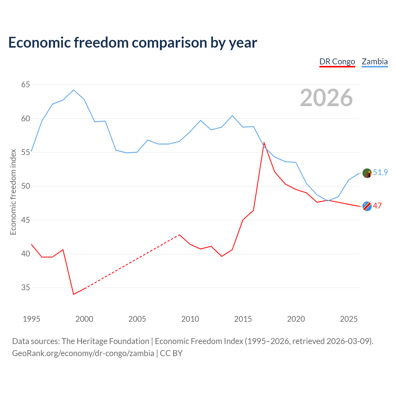 The Economic Freedom Index for the DR Congo is 47, ranking 176/197, compared to 51.9 for Zambia, ranking 152/197. The chart above displays a comparison of annual changes in economic freedom indexes.