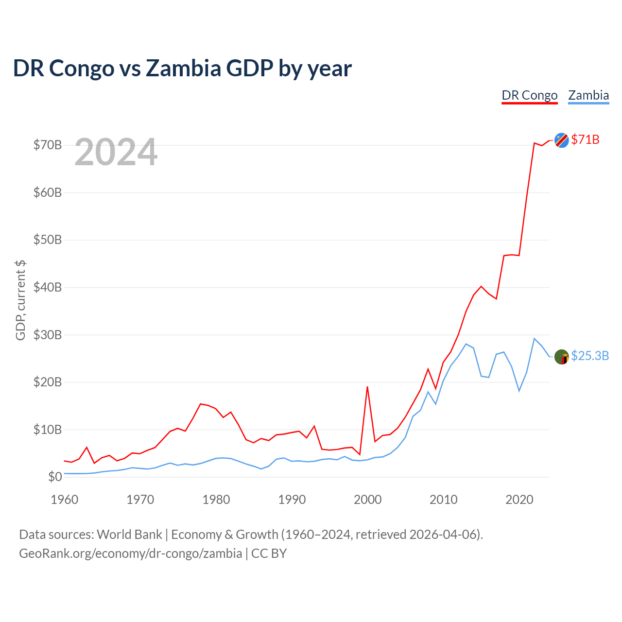 The DR Congo has a GDP of $71B compared to $25.3B for Zambia, ranking 87/197 and 116/197 by economy size, respectively.