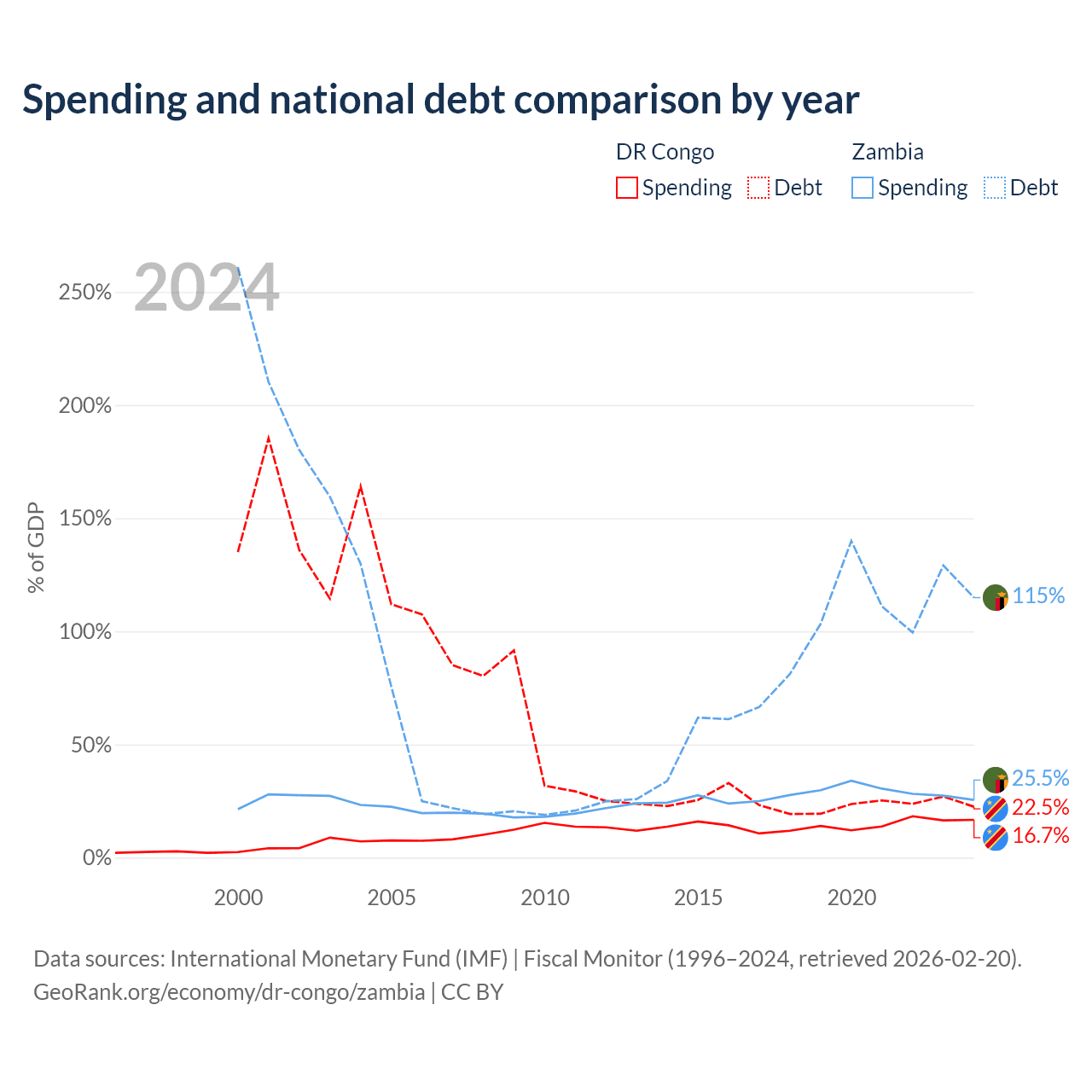 The DR Congo has $16B in government debt (22.5% of GDP), compared to $29.1B (114.9% of GDP) in Zambia.