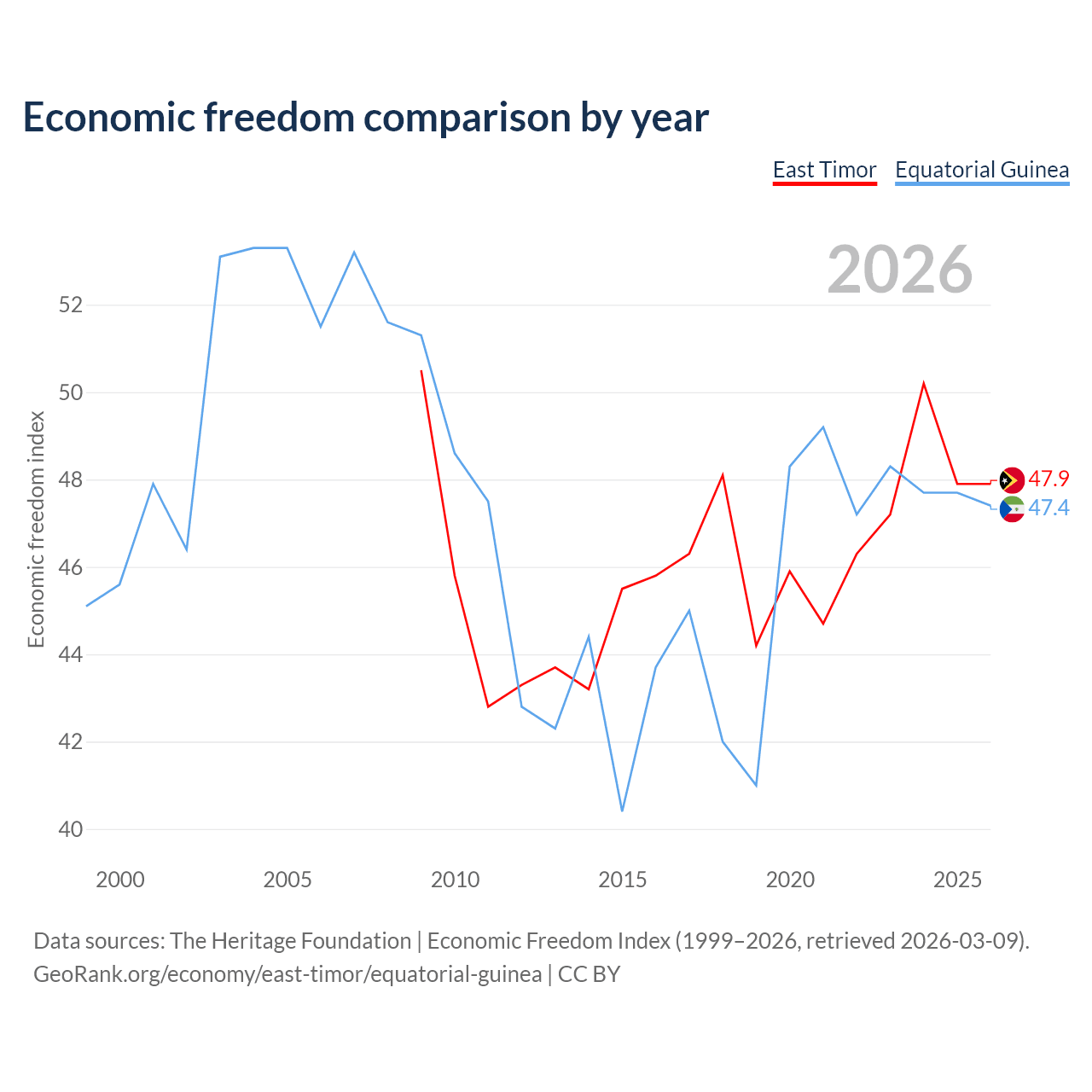 The Economic Freedom Index for East Timor is 47.9, ranking 173/197, compared to 47.4 for Equatorial Guinea, ranking 175/197. The chart above displays a comparison of annual changes in economic freedom indexes.