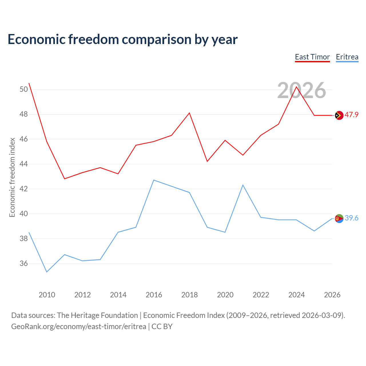 The Economic Freedom Index for East Timor is 47.9, ranking 173/197, compared to 39.6 for Eritrea, ranking 188/197. The chart above displays a comparison of annual changes in economic freedom indexes.