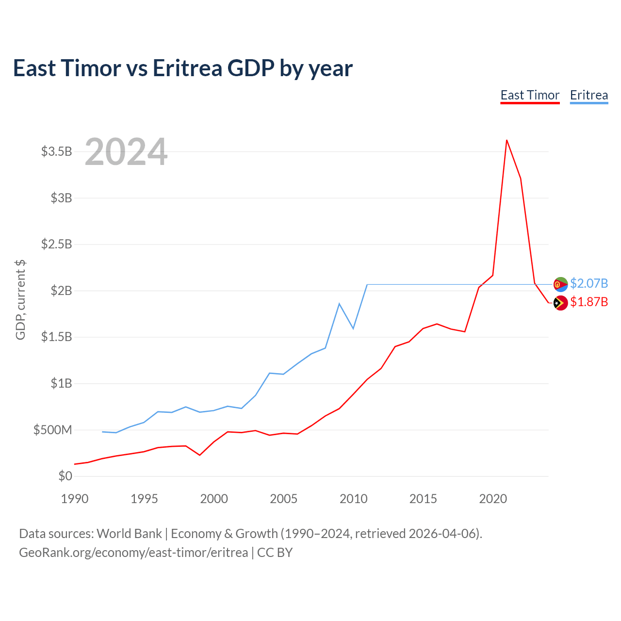 East Timor has a GDP of $1.87B compared to $2.07B for Eritrea, ranking 181/197 and 179/197 by economy size, respectively.