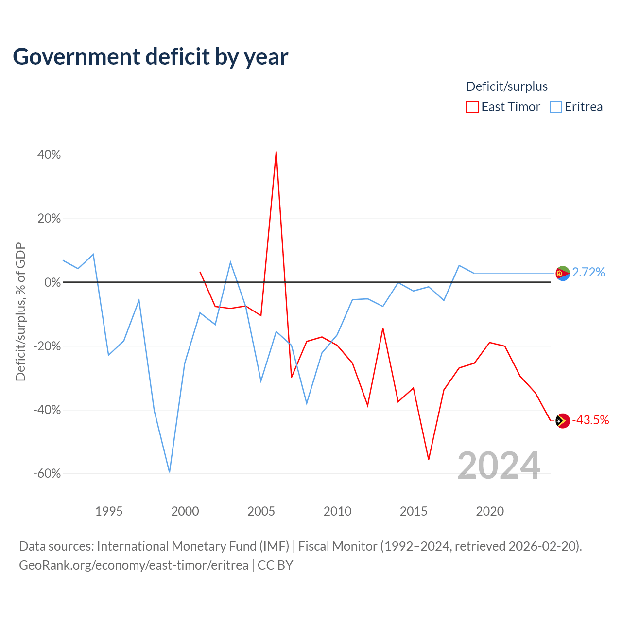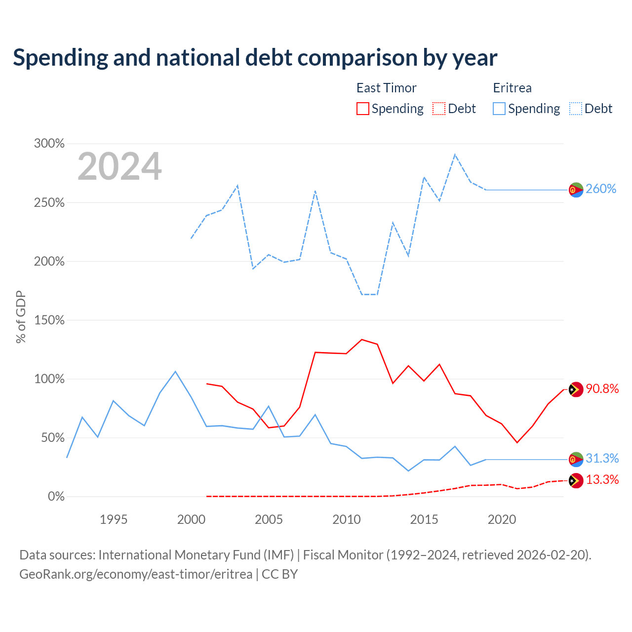 East Timor has $249M in government debt (13.3% of GDP), compared to $3.54B (260.4% of GDP) in Eritrea.