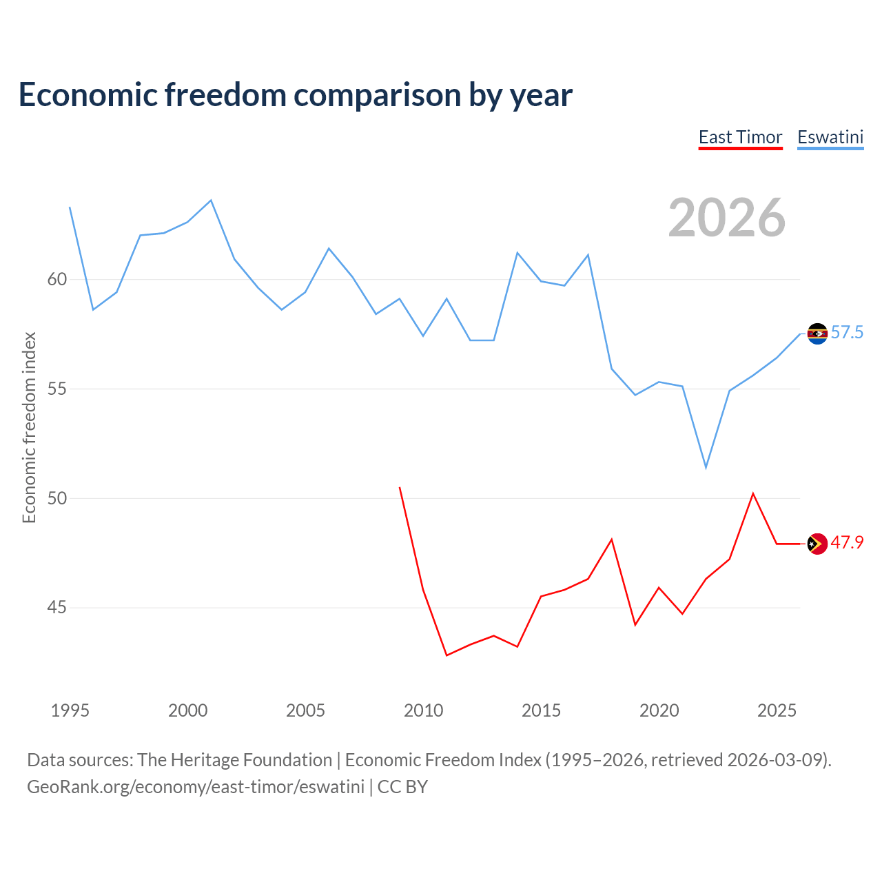 The Economic Freedom Index for East Timor is 47.9, ranking 173/197, compared to 57.5 for Eswatini, ranking 116/197. The chart above displays a comparison of annual changes in economic freedom indexes.
