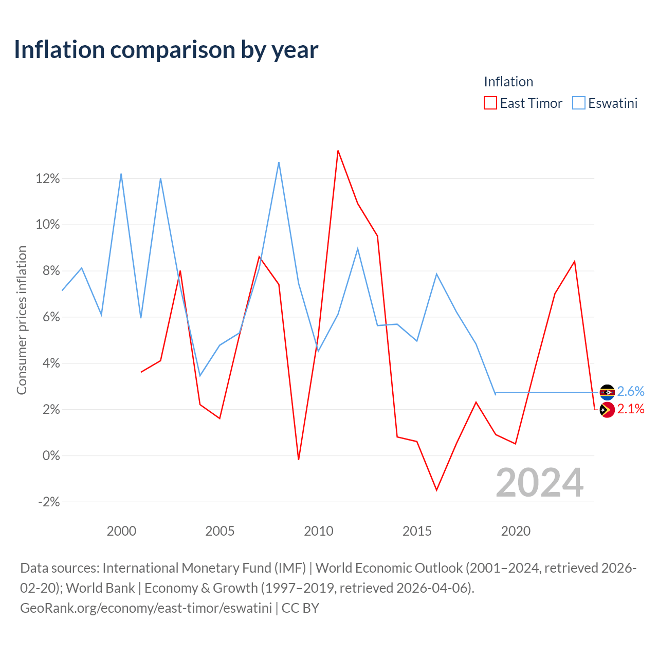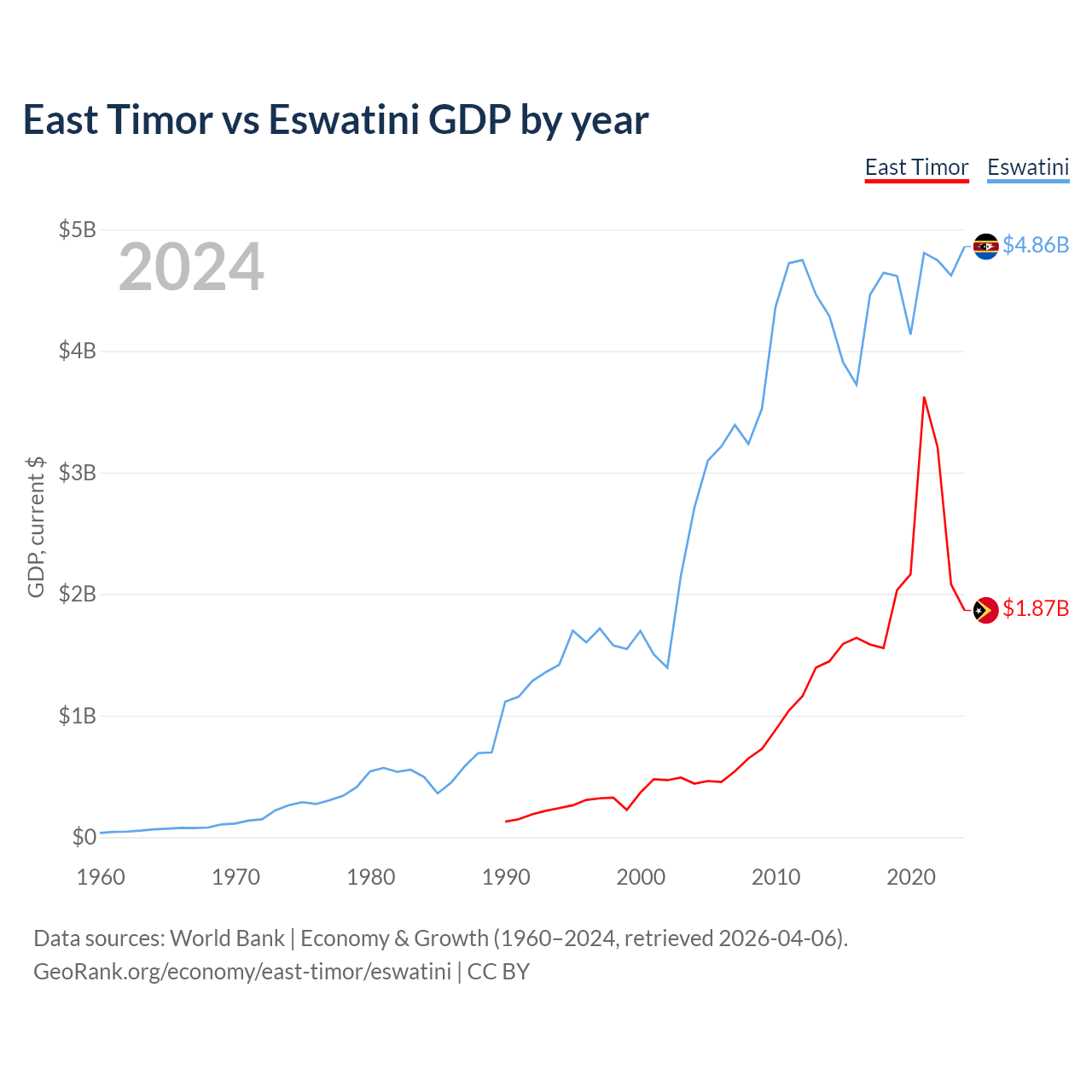 East Timor has a GDP of $1.87B compared to $4.86B for Eswatini, ranking 181/197 and 162/197 by economy size, respectively.
