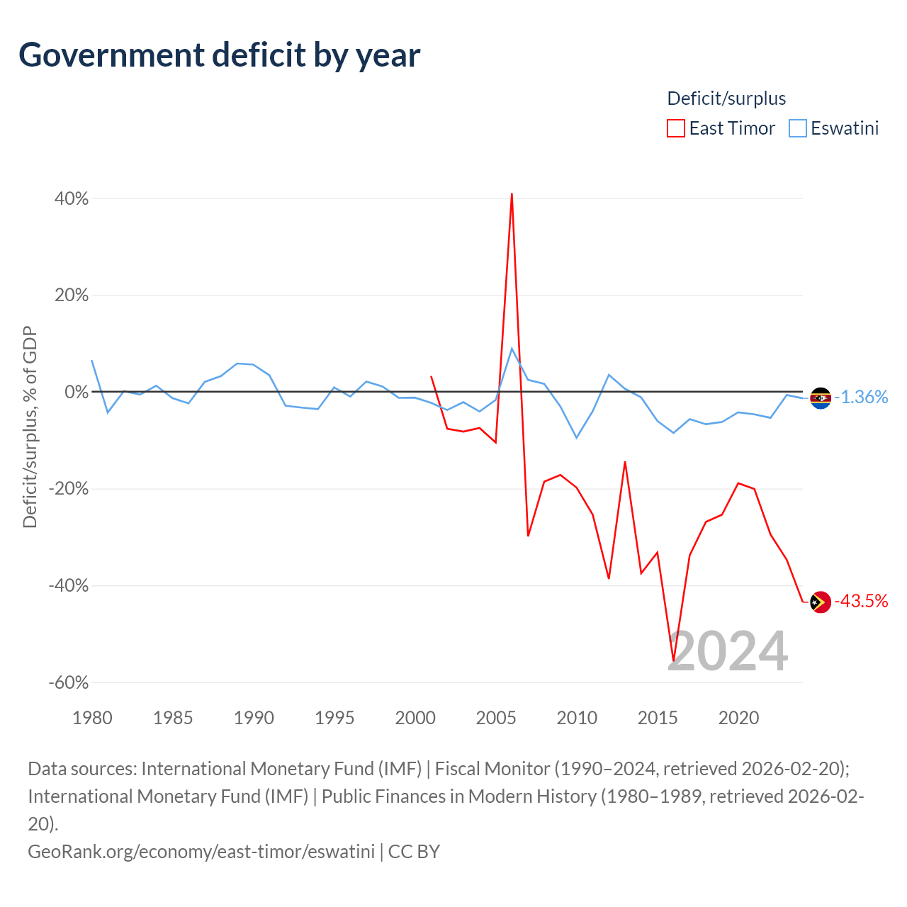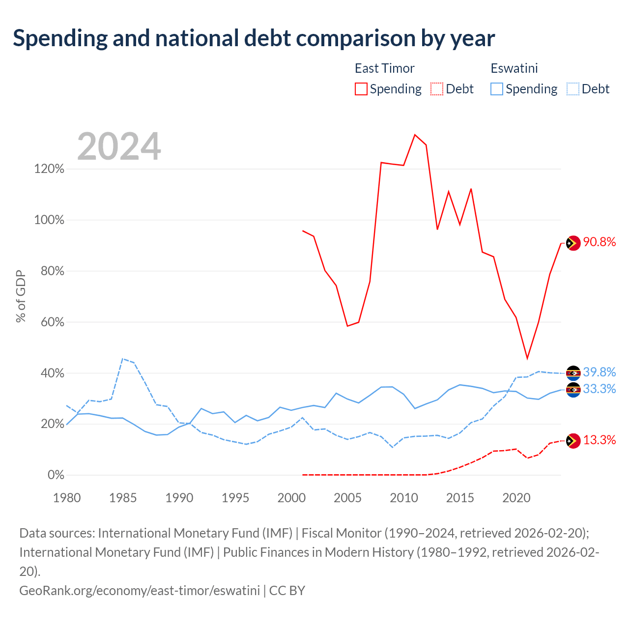 East Timor has $249M in government debt (13.3% of GDP), compared to $1.93B (39.8% of GDP) in Eswatini.