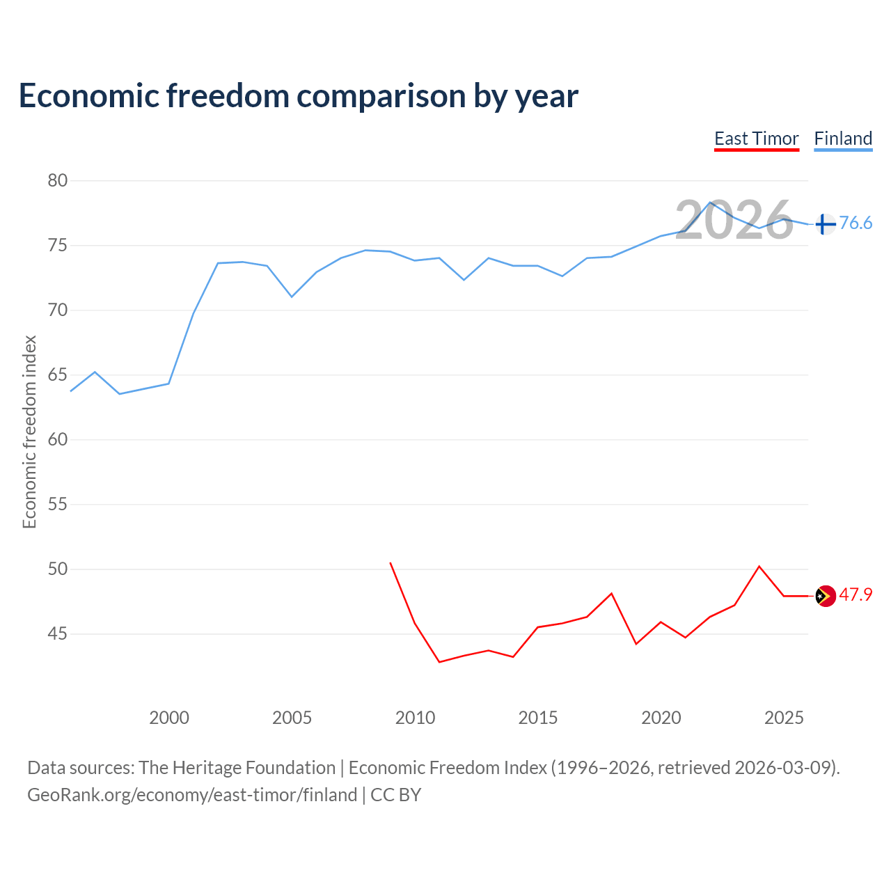 The Economic Freedom Index for East Timor is 47.9, ranking 173/197, compared to 76.6 for Finland, ranking 15/197. The chart above displays a comparison of annual changes in economic freedom indexes.