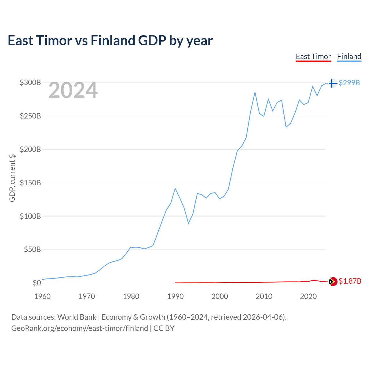 East Timor has a GDP of $1.87B compared to $299B for Finland, ranking 181/197 and 47/197 by economy size, respectively.