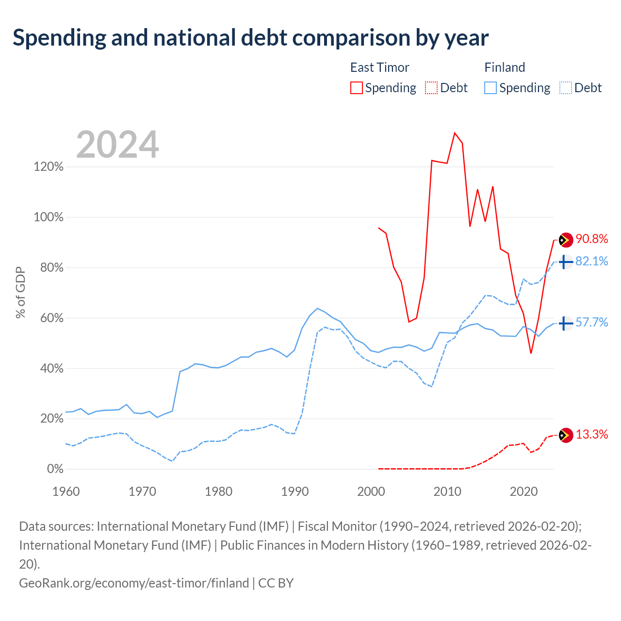 East Timor has $249M in government debt (13.3% of GDP), compared to $245B (82.1% of GDP) in Finland.