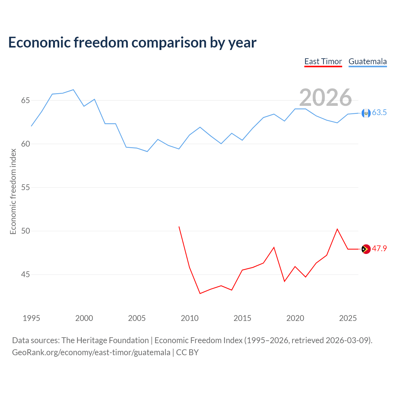 The Economic Freedom Index for East Timor is 47.9, ranking 173/197, compared to 63.5 for Guatemala, ranking 79/197. The chart above displays a comparison of annual changes in economic freedom indexes.