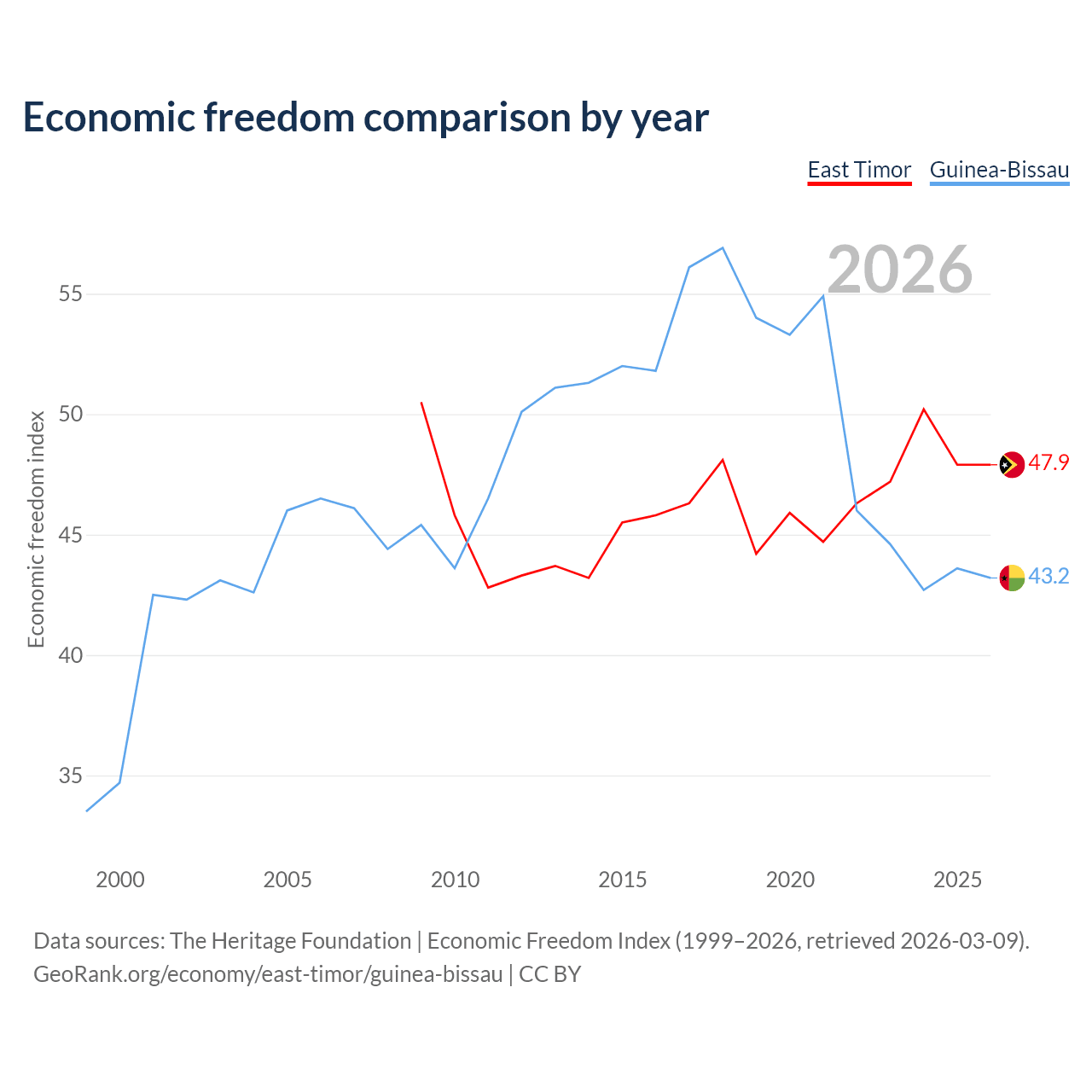 The Economic Freedom Index for East Timor is 47.9, ranking 173/197, compared to 43.2 for Guinea-Bissau, ranking 181/197. The chart above displays a comparison of annual changes in economic freedom indexes.
