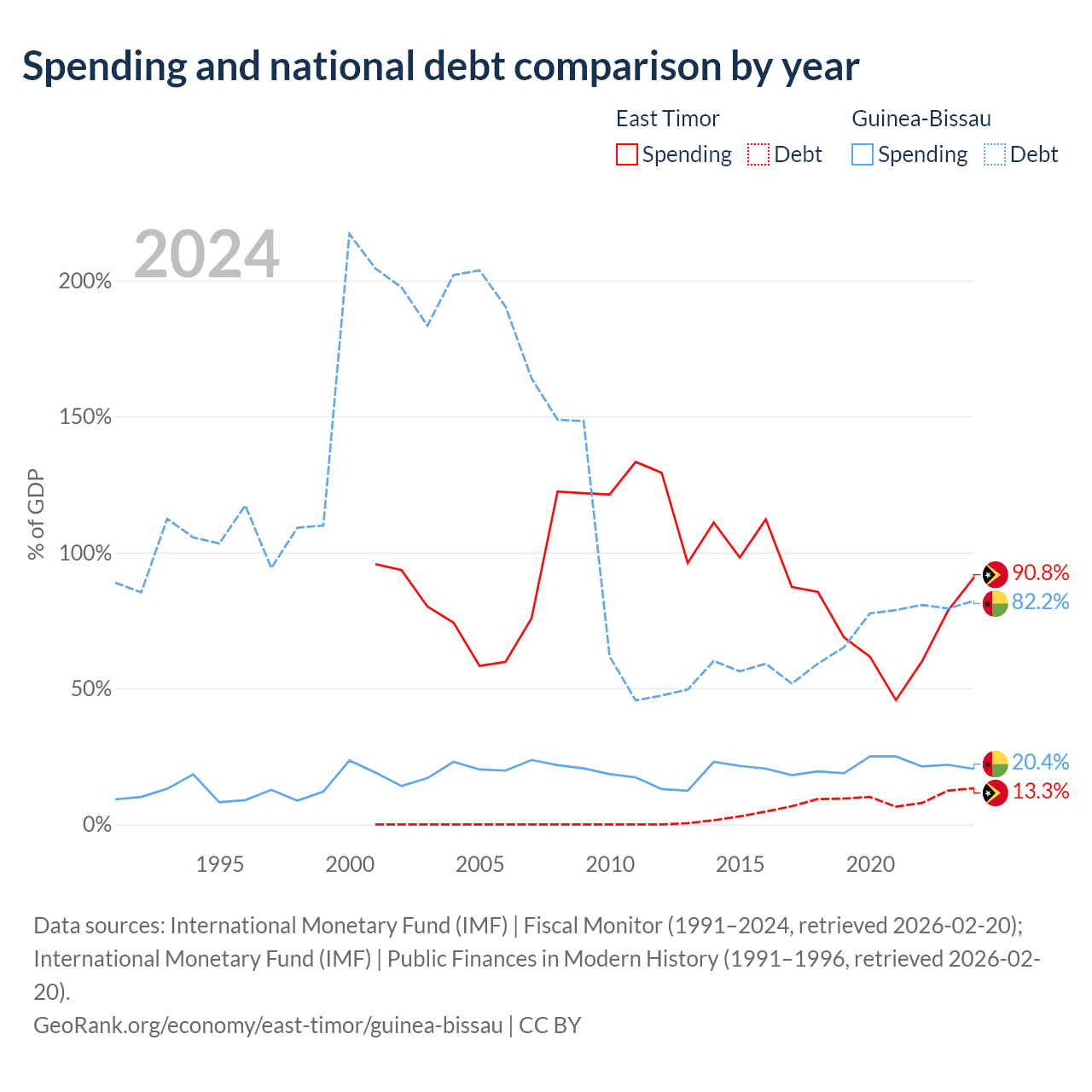 East Timor has $249M in government debt (13.3% of GDP), compared to $1.82B (82.2% of GDP) in Guinea-Bissau.